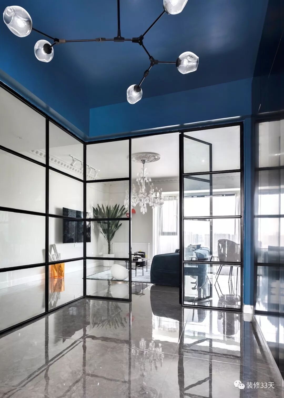 ▲ 书房+衣帽间选用透明玻璃隔断,墙面采用一抹蓝色调于沙发呼应,搭配黑色收纳柜,颇具个性