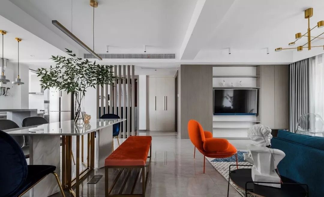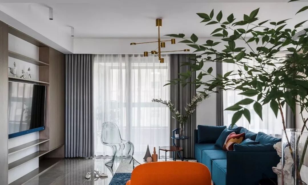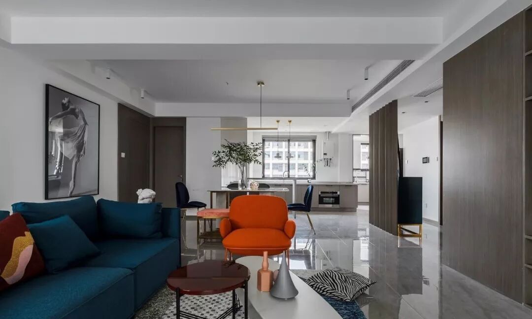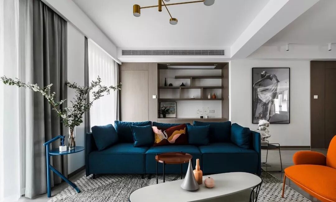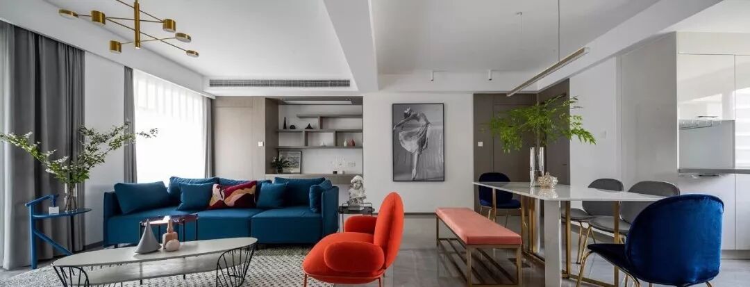 ▲ 蓝色三人沙发搭配个性十足的茶几与边几,造型圆润的橙色单椅提升室内色调,注入热情与活力