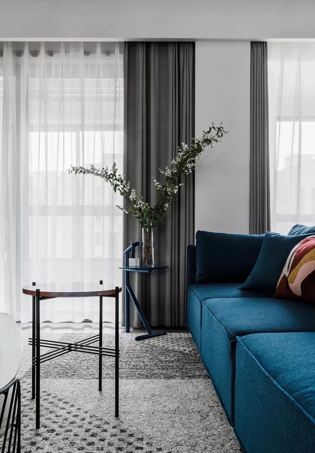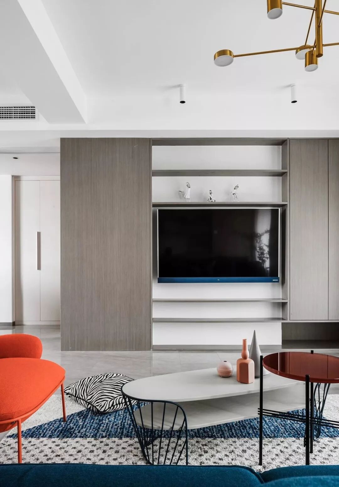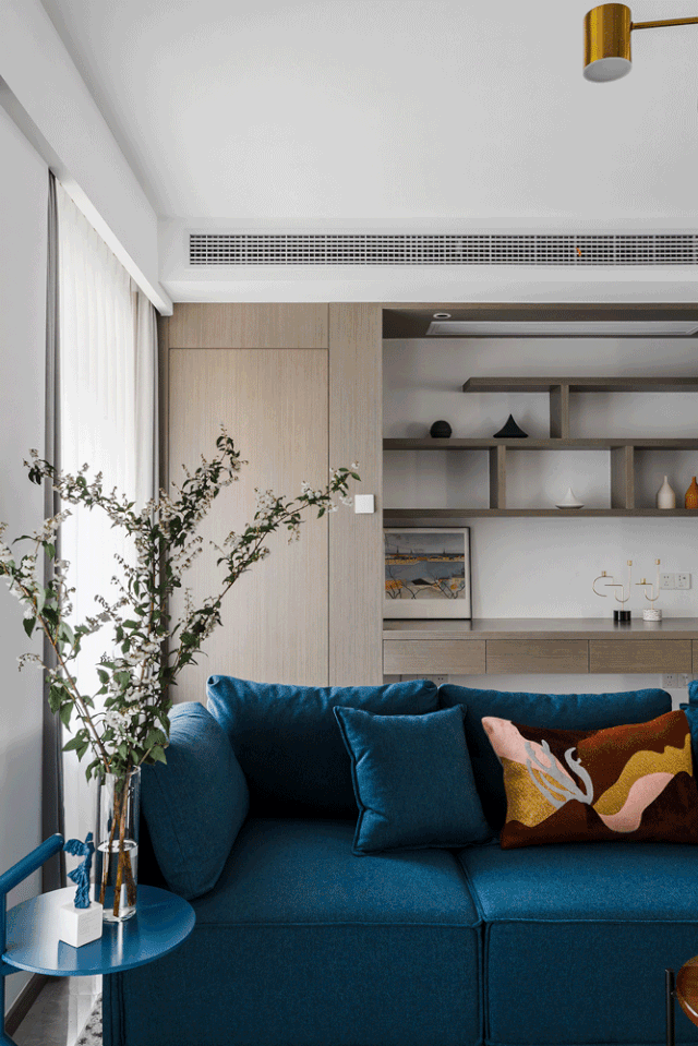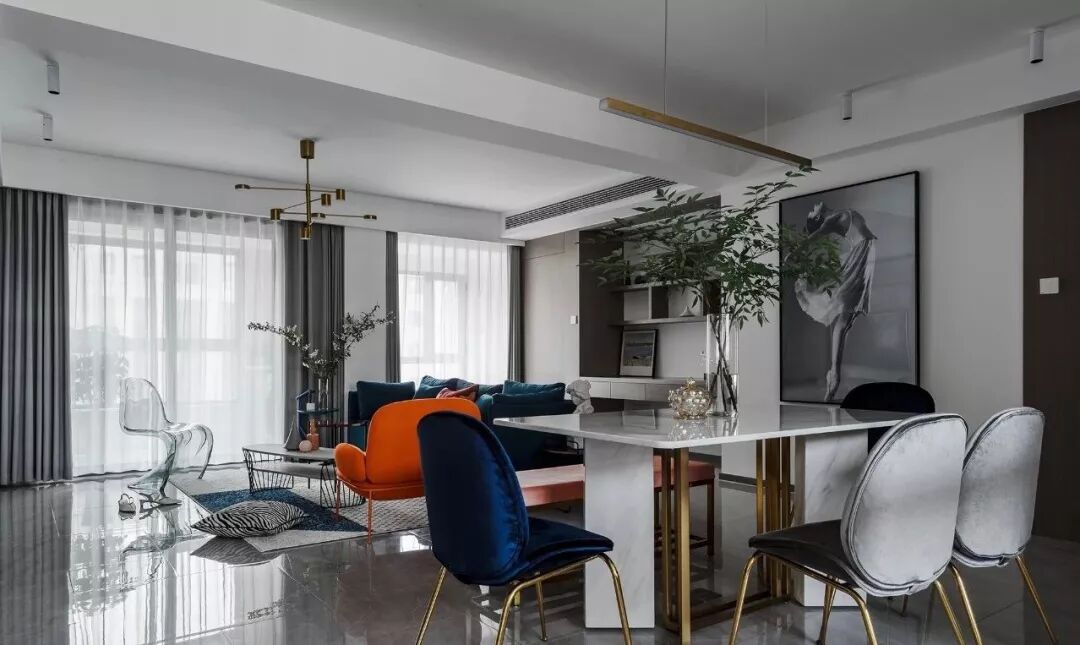 ▲ 蓝色三人沙发搭配个性十足的茶几与边几,造型圆润的橙色单椅提升室内色调,注入热情与活力