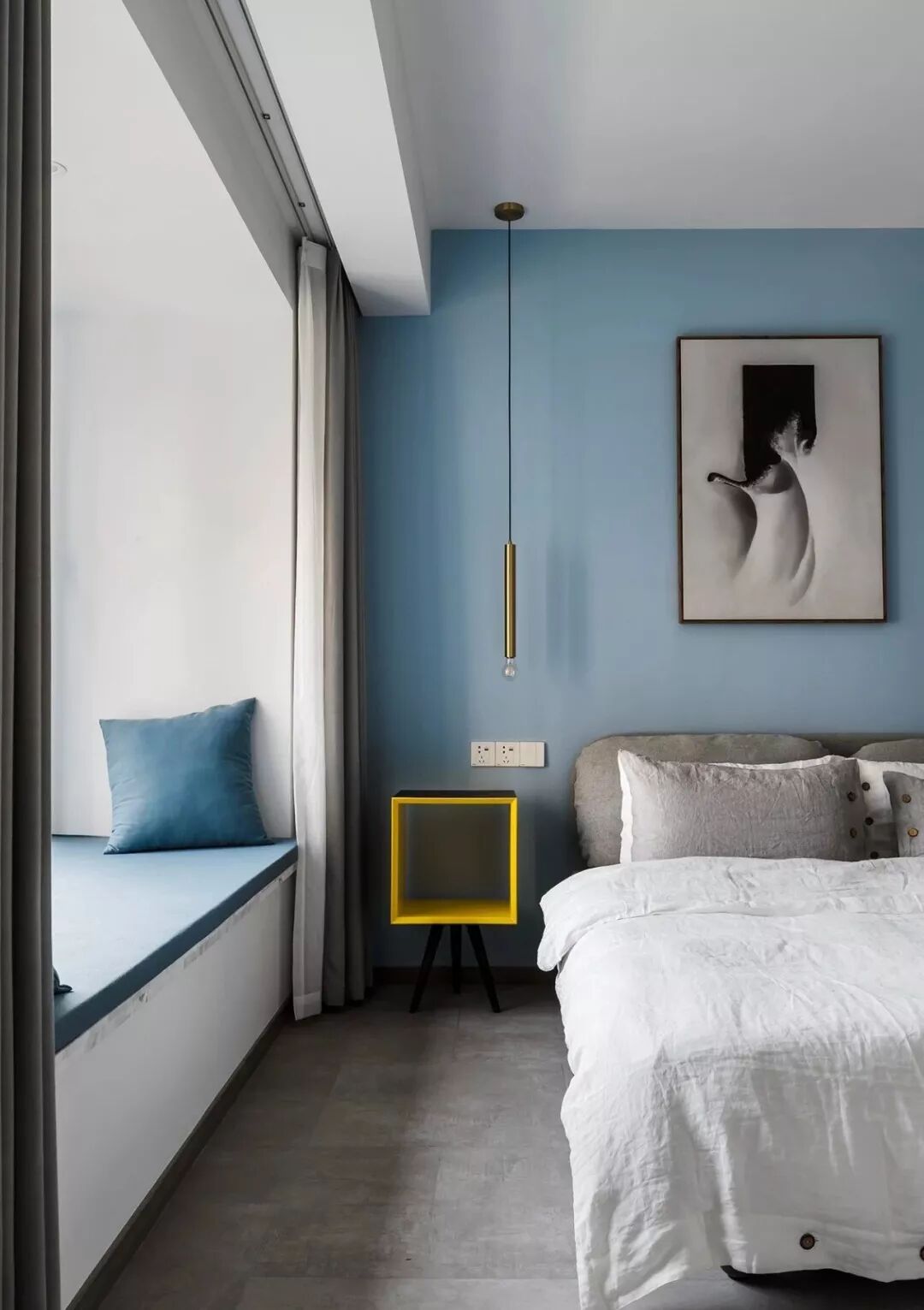 ▲ 主卧,飘窗与背景墙均采用让人平静的视觉蓝,搭配灰色大床,与金色线性吊灯