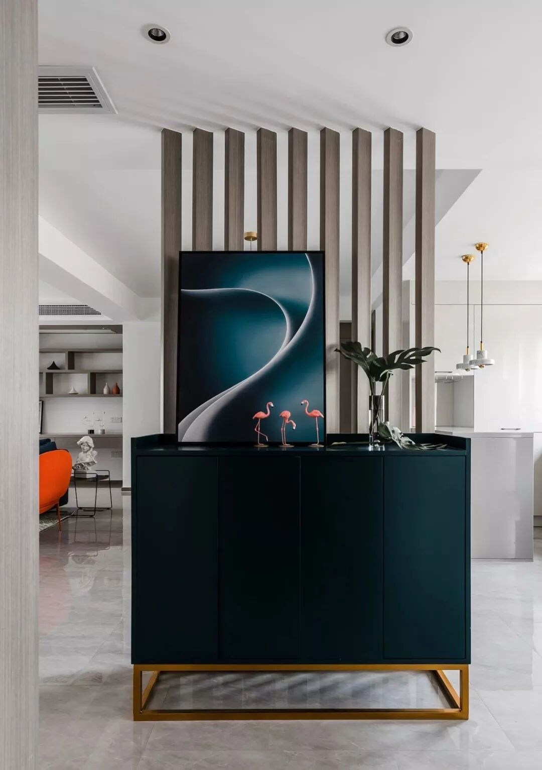 ▲ 建筑面积125平,造价32万(不含电器),玄关采用斜面格栅结合玄关柜,辅以装饰画与火烈鸟摆件做修饰