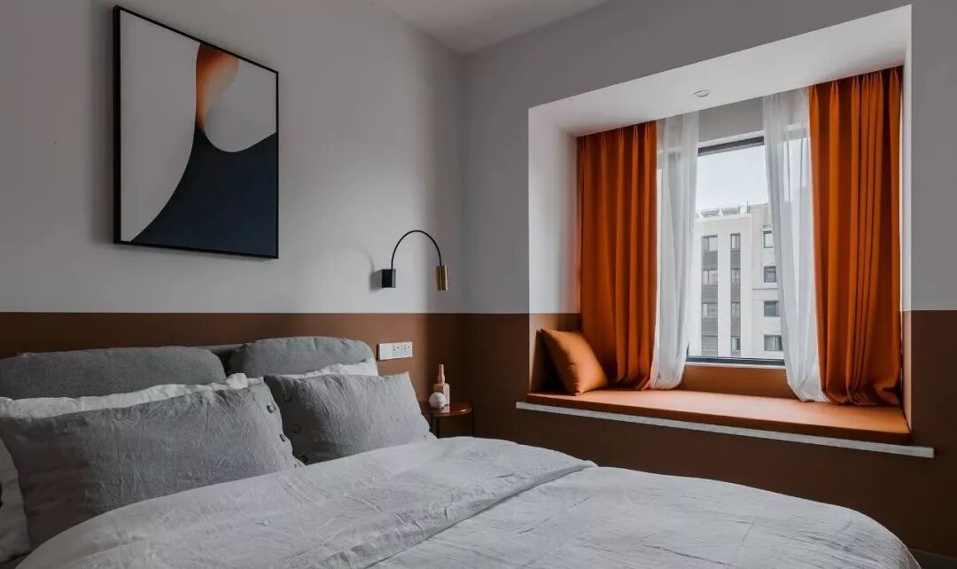 ▲ 次卧做老人房,降低饱和度的橙色从半高墙面延伸至飘窗,搭配浅灰色上半墙,辅以壁灯与装饰画
