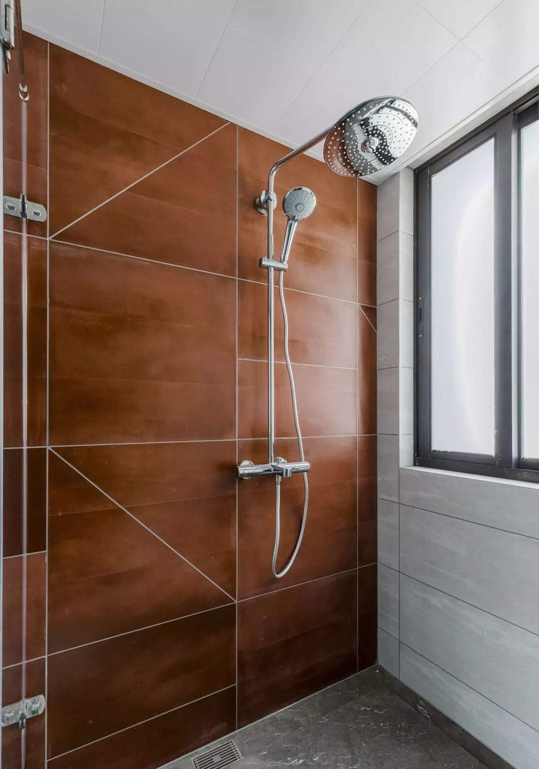 ▲ 卫生间,淋浴背景采用咖色瓷砖切割拼贴,地面石材四周设计导水槽,使下水更加高效
