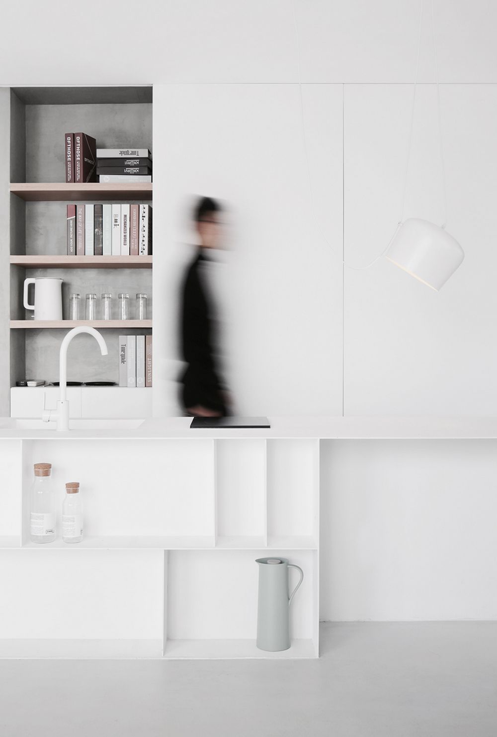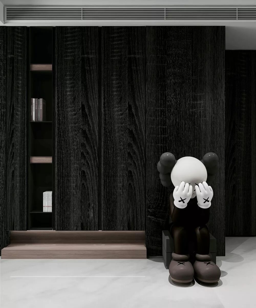 空间内基本功能的布置设置在四周,由几道移门解决了储物、卫浴、洗烘的功能。