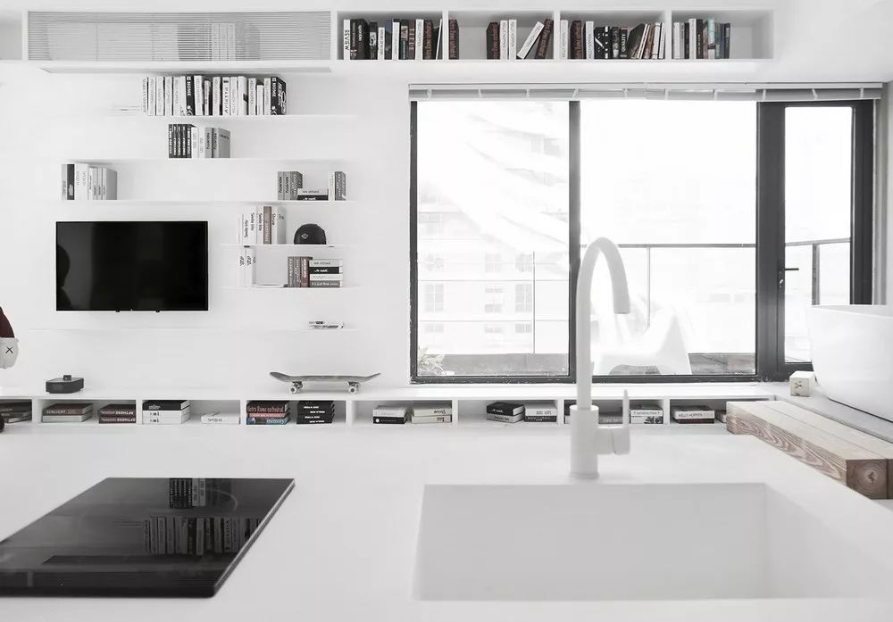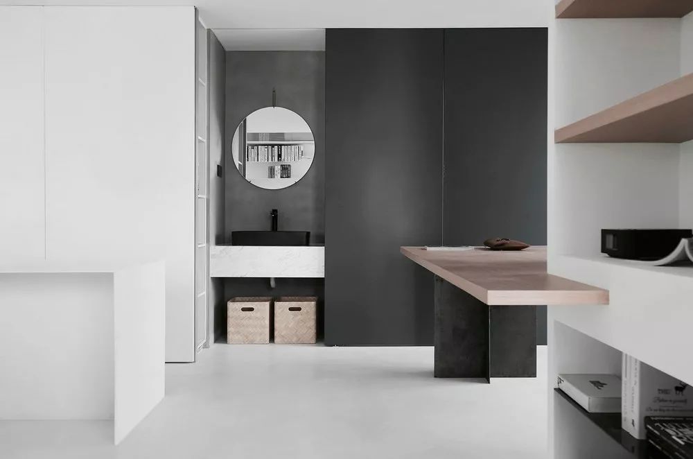 书桌处的移动门解决了储物和洗手的功能