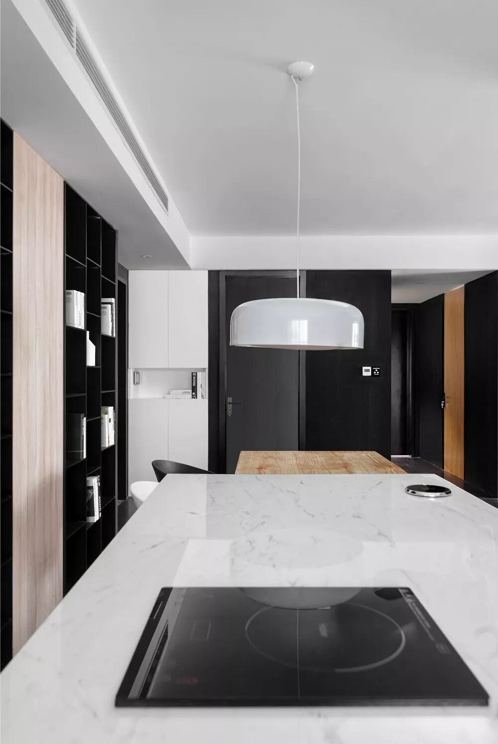 大理石的中岛 嵌入了手机无线充电面板 电磁炉. 增加了岛台使用的便利性.中岛背部也做了抽屉柜体及烤箱的收纳处理.
