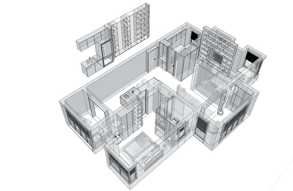 本案为高层住宅项目面对地产商交付后千篇一律的户型结构我们调整了空间区域的划分将原有的卧室空间纳为公共区域. 结合了西厨加餐厅的功能使客餐厅形成了L形的空间.