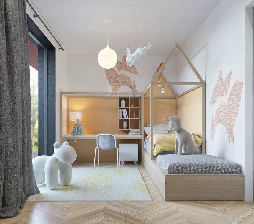 学龄前儿童,除了能跑能走,还能掌握读、写和简单动手能力。所以,空间尽可能搭配一些可写写画画和玩乐的设计。