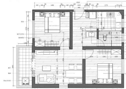 这套房子原本户型是三个卧室加一个过道客厅,房门都开在外边的厅;设计师在格局上做了修改,改为两室一厅,把原过道厅改为卫生间的干区,厨房变为开放式,将原来有阳台的主卧变为客厅,两个卧室门都改在厅里,这样原来的过道更加开阔,并且让客厅的功能得以更好地发挥。且卧室门从原过道移入室内,不对入户门,更加私密。