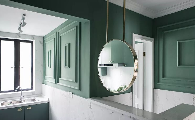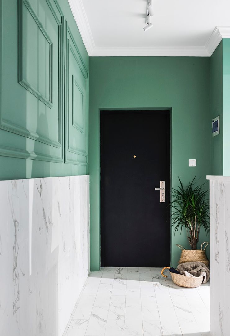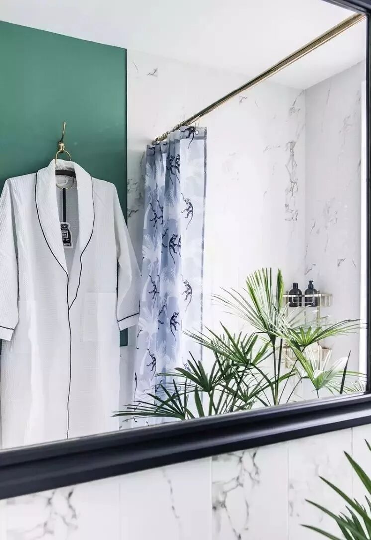 推门就是满眼作为主题的水绿色,墙面采用古典装饰木线条,搭配干净清爽的爵士白大理石瓷砖,营造优雅时髦的感觉。