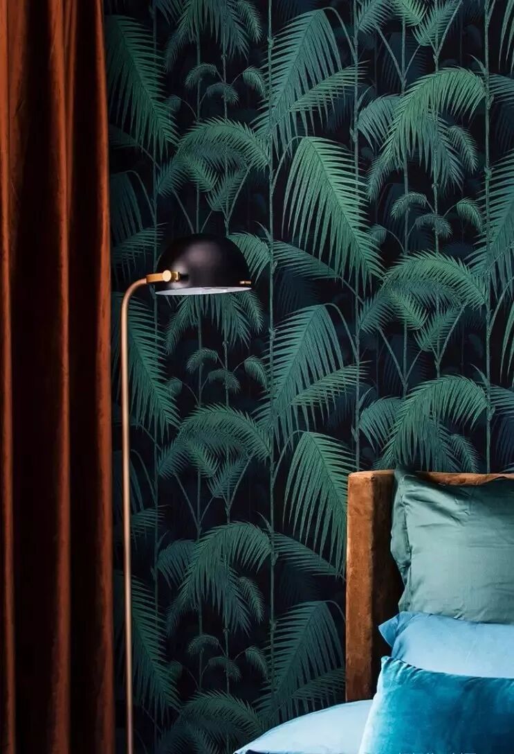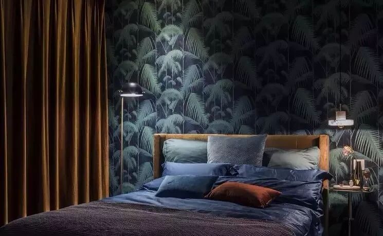主卧的壁纸,将我们迅速带入丛林的感觉中,枫糖橙的窗帘和床头呼应着丛林蜜意的大主题,也为沉静清凉的绿意中注入一丝活泼和温暖。