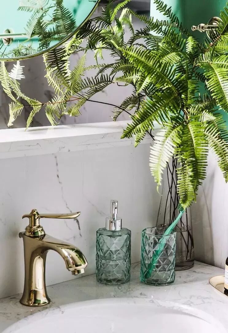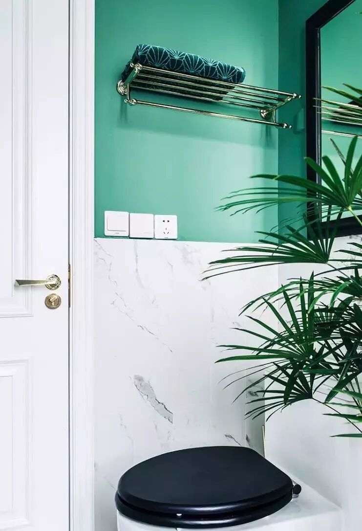 绿色墙面搭配金色五金,颇具个性的黑色复古马桶盖,都营造出一种有情调的精致感 。