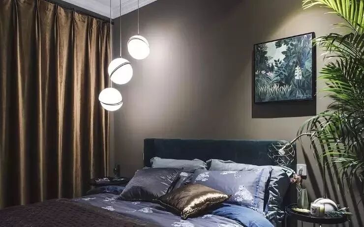 次卧采用了褐色的墙面,能营造出一种大地和泥土的感觉,窗帘用了和墙面接近的一种黄褐色,丝绒材质加上灯光的折射呈现出一种金色的质感,将略显沉闷的墙进行了提亮。
