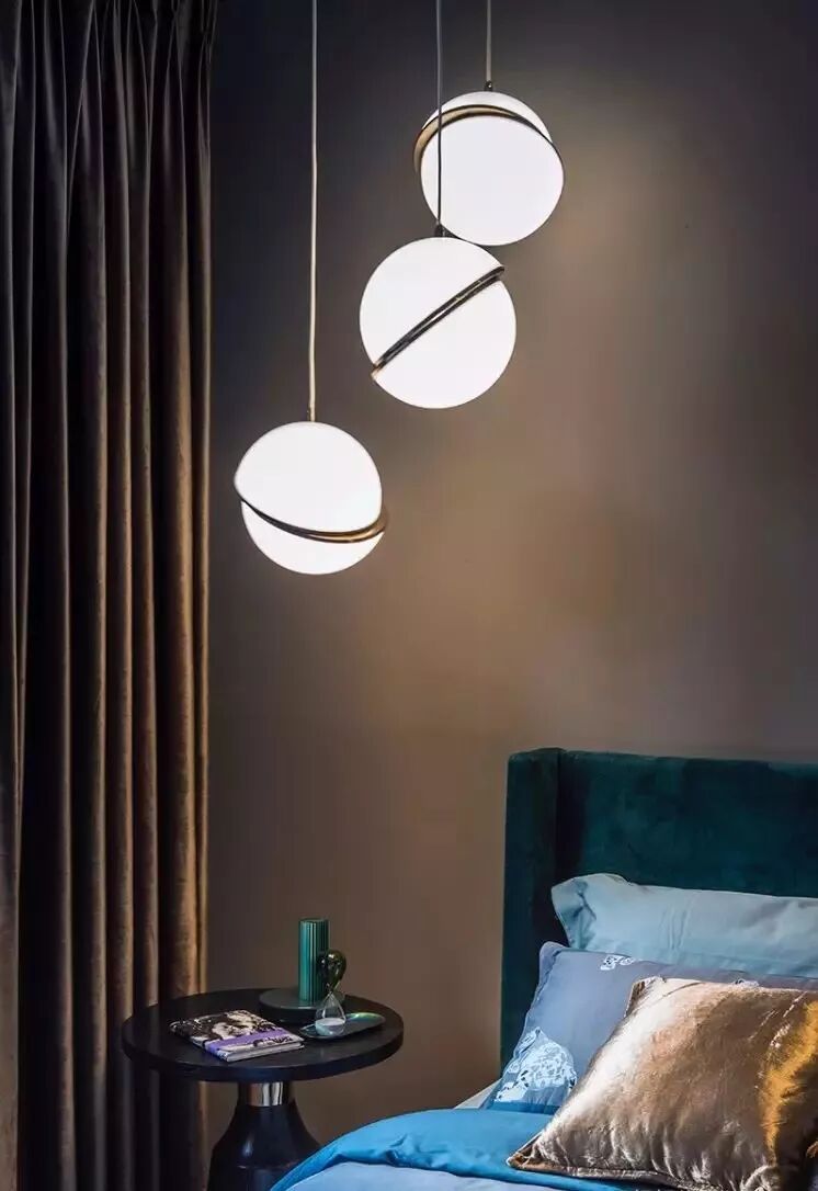 床头不对称的床头灯设计非常流行,一边是吊灯另一边是落地灯,虽然造型不一样,但通过控制色彩和外形,一样能在视觉上取得一种和谐对称的效果。
