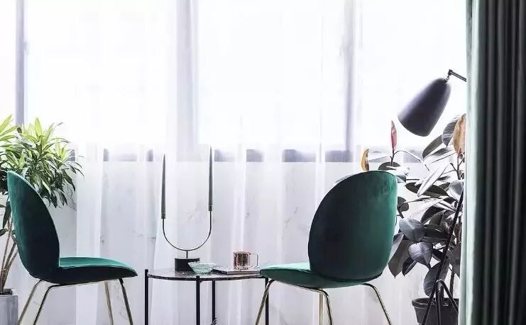 舒适惬意的阳台一角,可作为客厅向户外的延伸,丝绒椅和大理石茶几的搭配时髦现代,白色窗纱前的一抹绿色格外清新悦目。