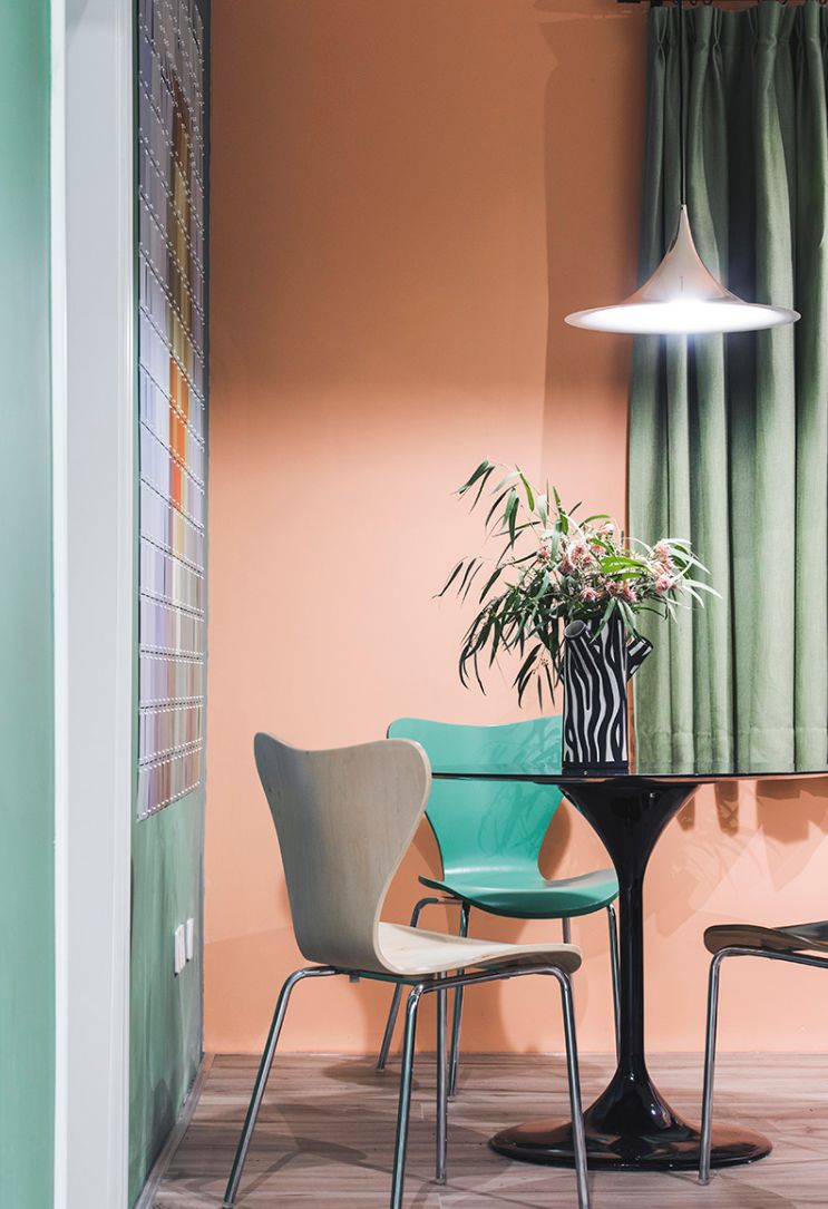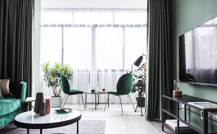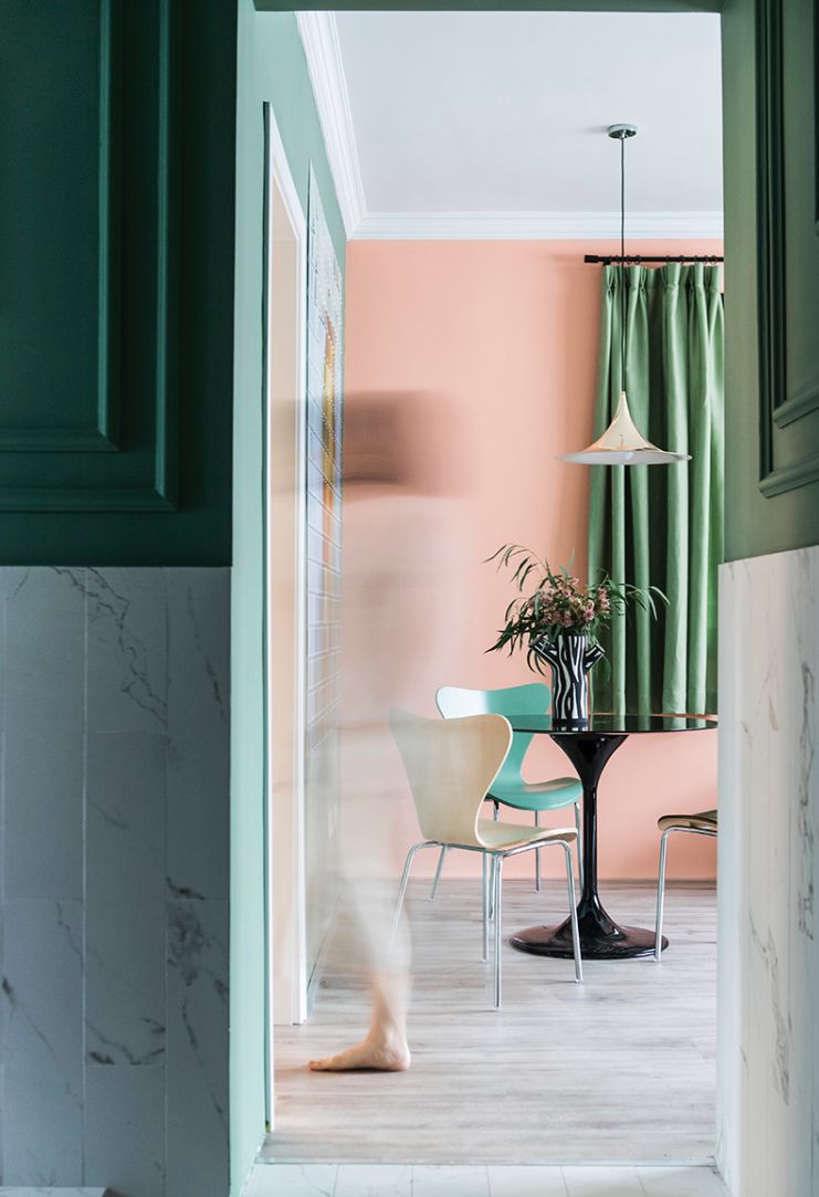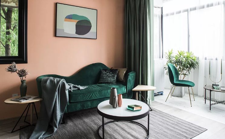 客厅的沙发背景墙使用颜色饱和度较低的粉橙色乳胶漆,因为饱和度较低不会和绿色主题产生违和感。丝绒沙发提升了空间的高级感,棉麻质地的宜家平织地毯带来一丝自然感。
