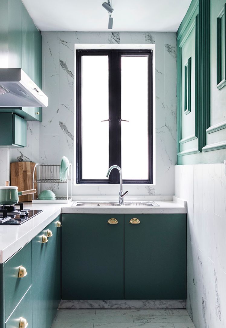 玄关左侧就是厨房,厨房内采用绿色哑光烤漆门板呼应主题,配的金色把手带来一丝复古质感,照明由轨道射灯提供,非常适合长条形的狭窄空间。