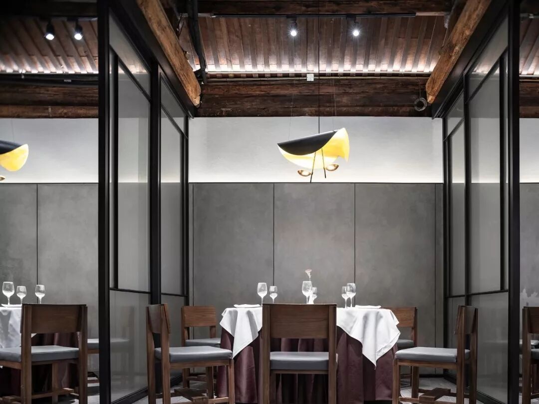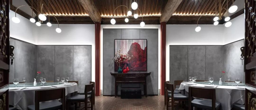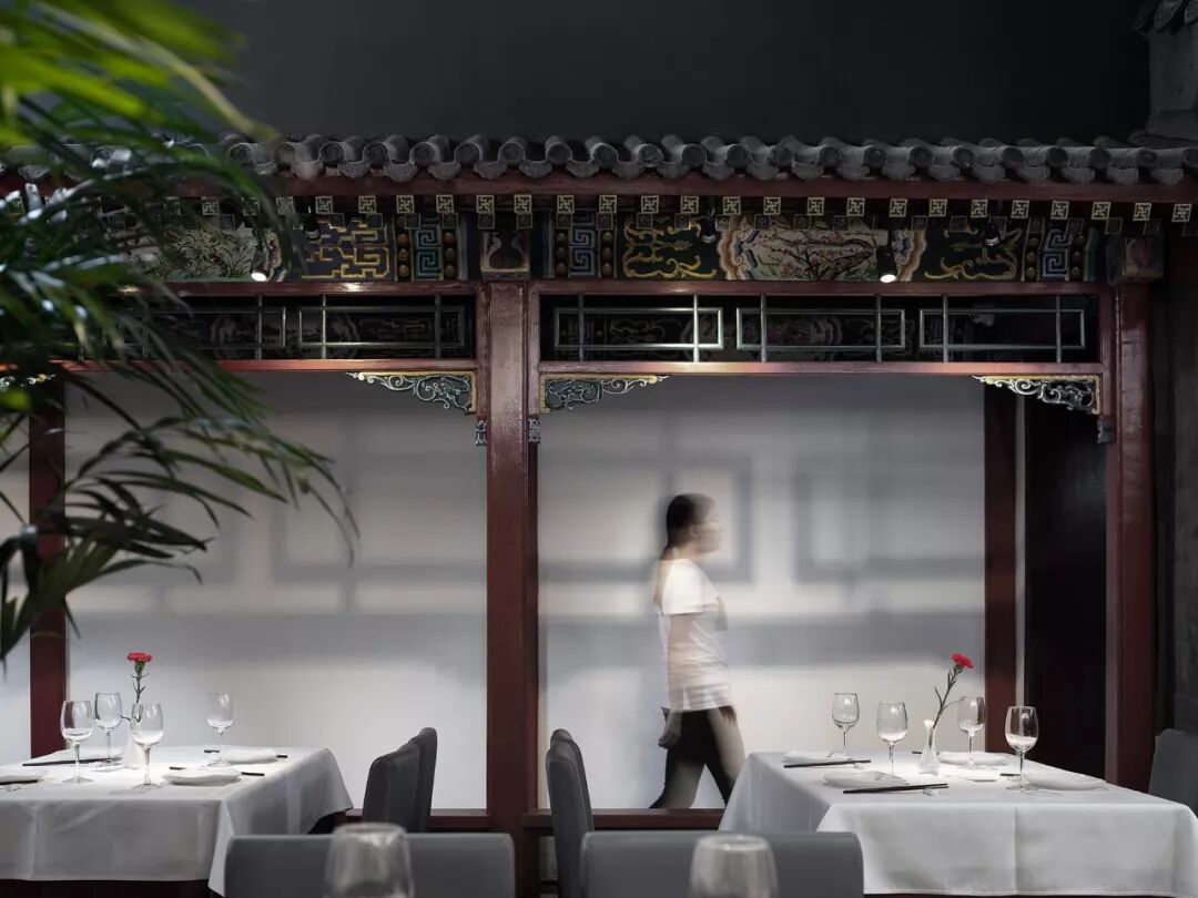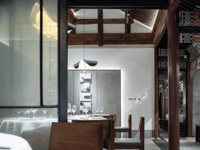 庭院成为开放性的用餐空间,初次踏入,美仑美奂。惊叹于传统雕廊画柱的精致细节,也惊叹于设计师对于尺度的把控,一切平衡得恰到好处。