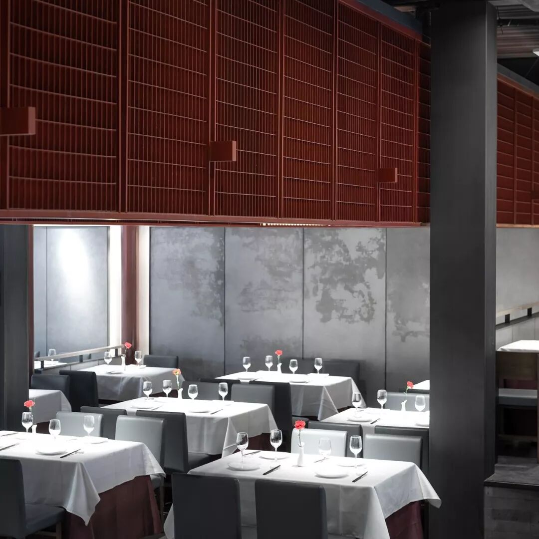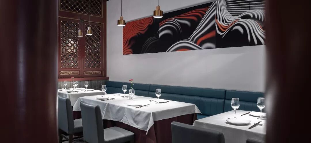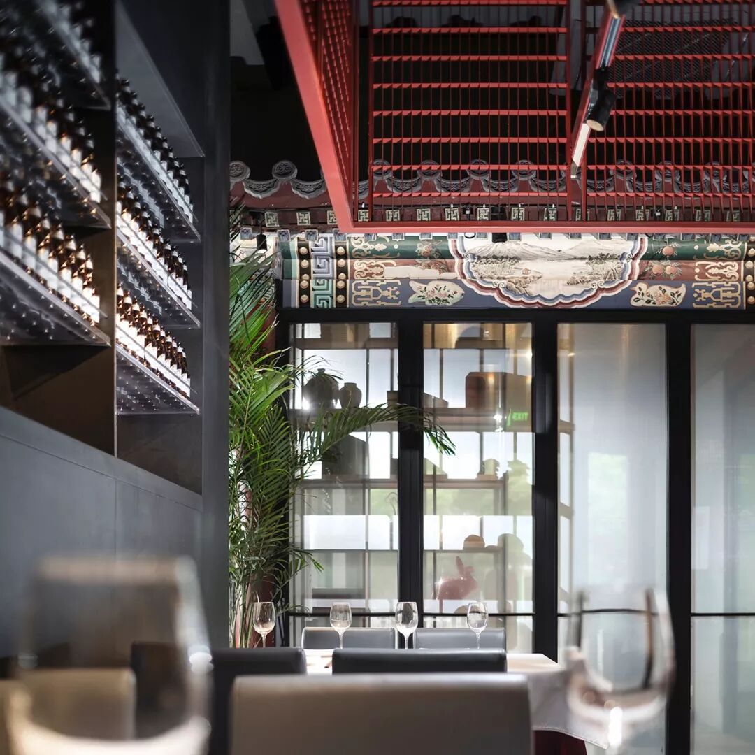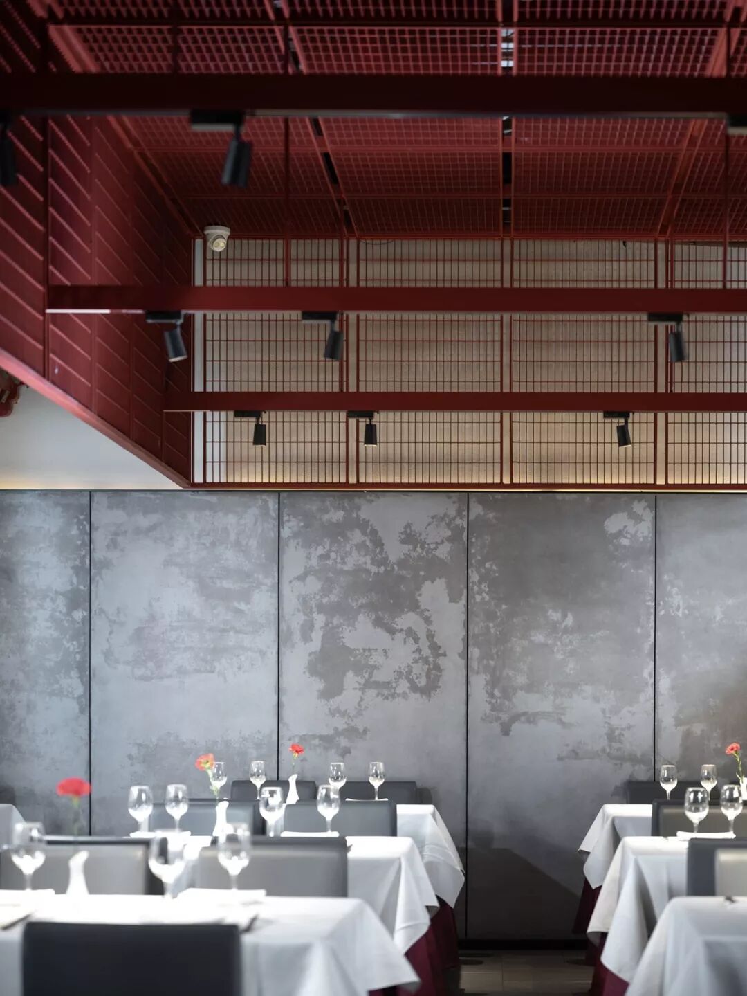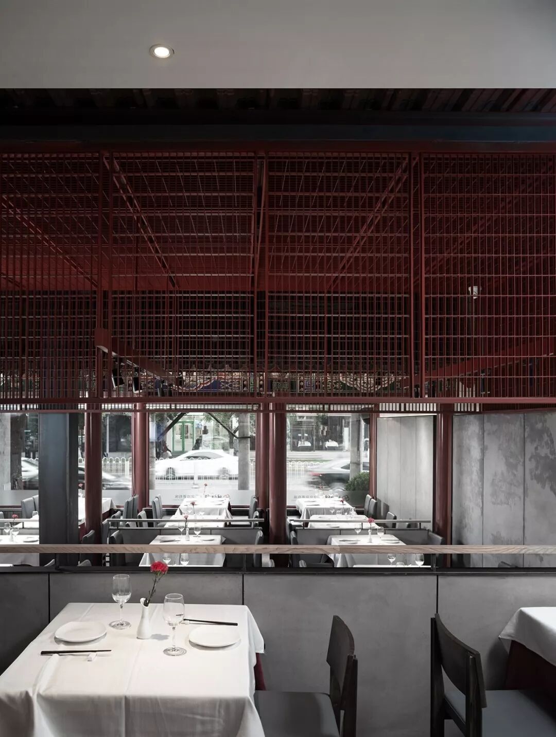 餐饮文化某一部分是地域精神的体现,标志性的红色成为院落的顶棚,设计师以独特的金属格栅与古建筑连接,形成一种新的建筑形态,也成为空间吸睛的一笔。