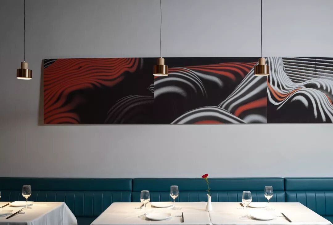转身至另一空间,别有韵味,背景墙面延续红色的空间基调,又以波纹线条塑造现代感,在细节之中,便可体察设计师的用心之处。