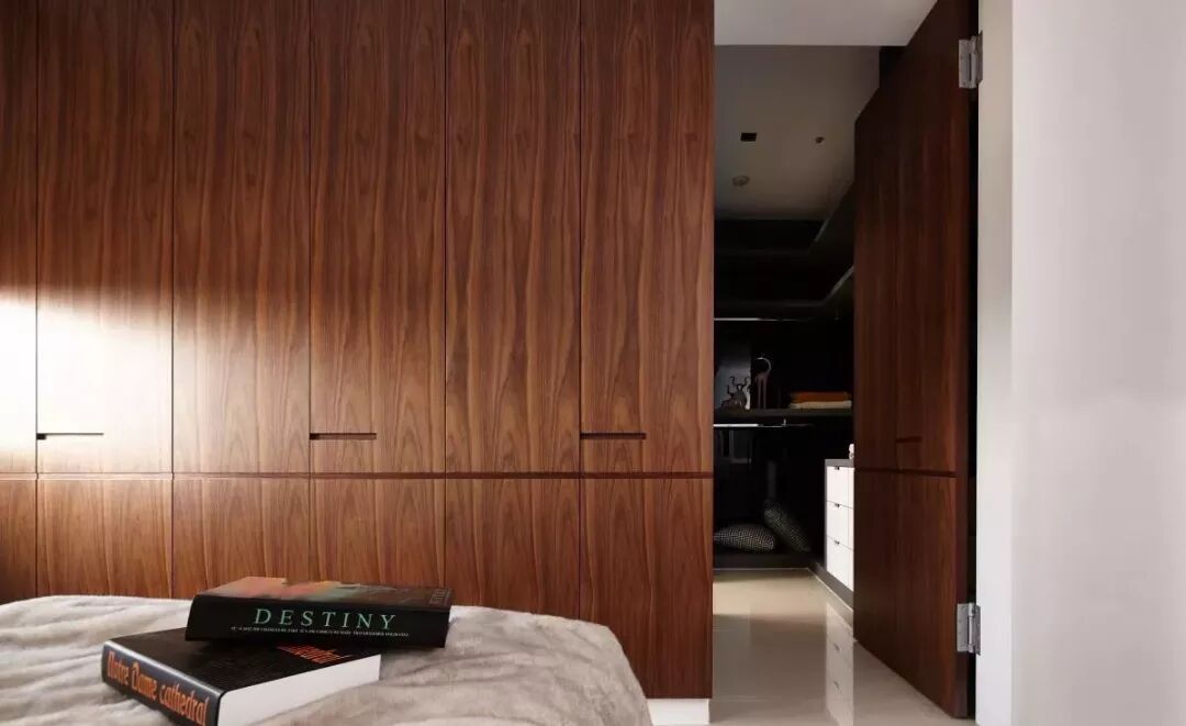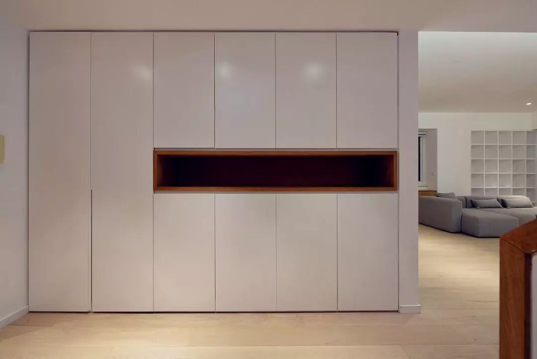 当然,既然要做隐形柜子,那么开门的问题咱们也得解决。要么在柜门之间留下能伸进手指的缝隙,要么在门板处做做文章,做到比门体长一些,如果都不喜欢,就考虑在门板背面装个反弹器,只需要按压就可以开合柜门,也很方便。