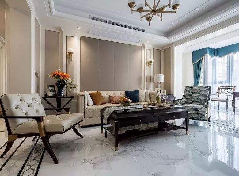 不只是电视背景墙,客厅的地面也很适合铺设大理石瓷砖,明亮的大理石瓷砖带着简单的纹理,搭配精致的软装,这样的客厅谁不爱?