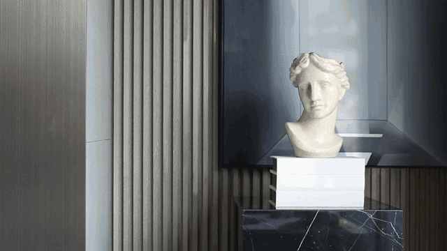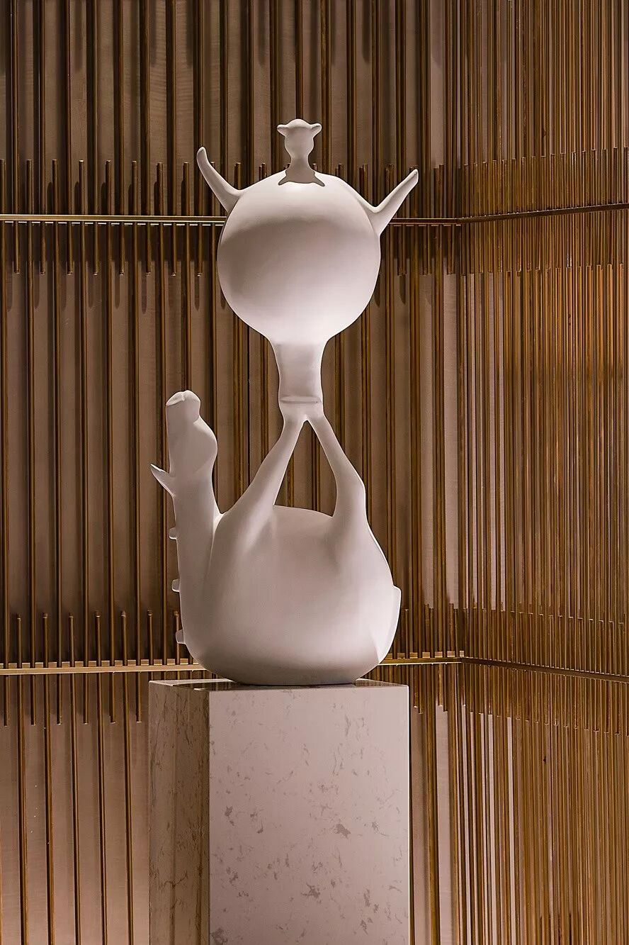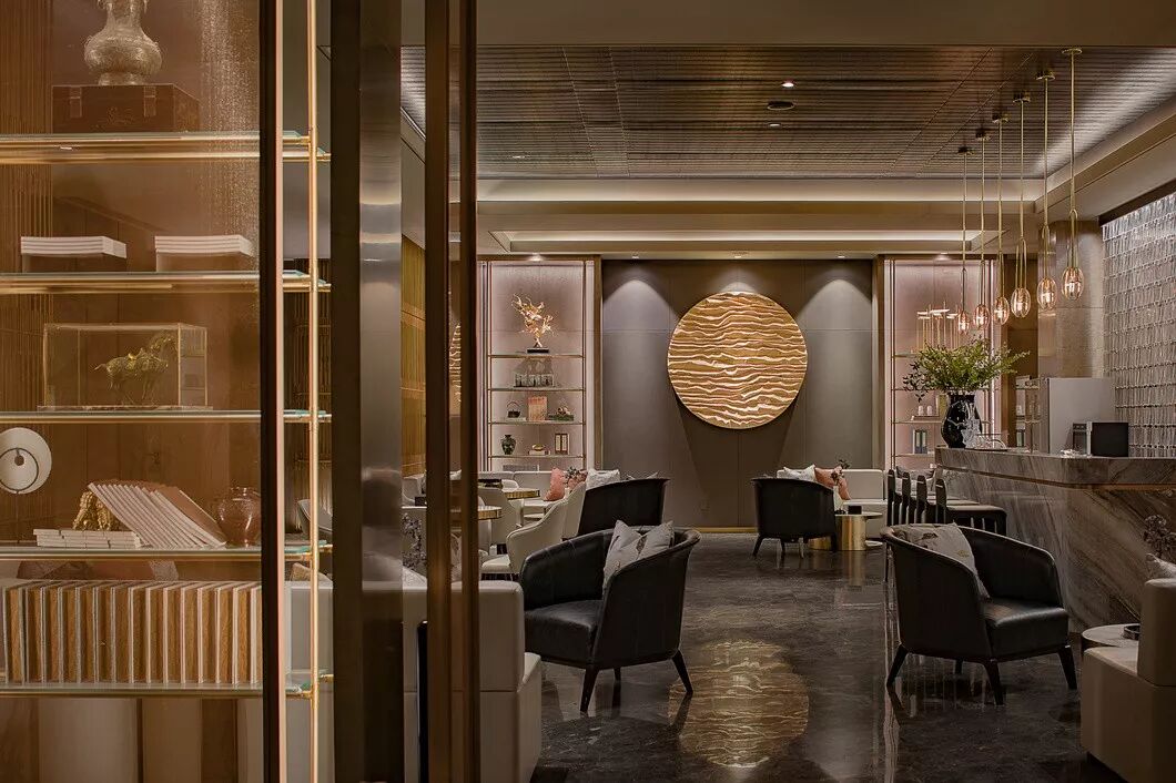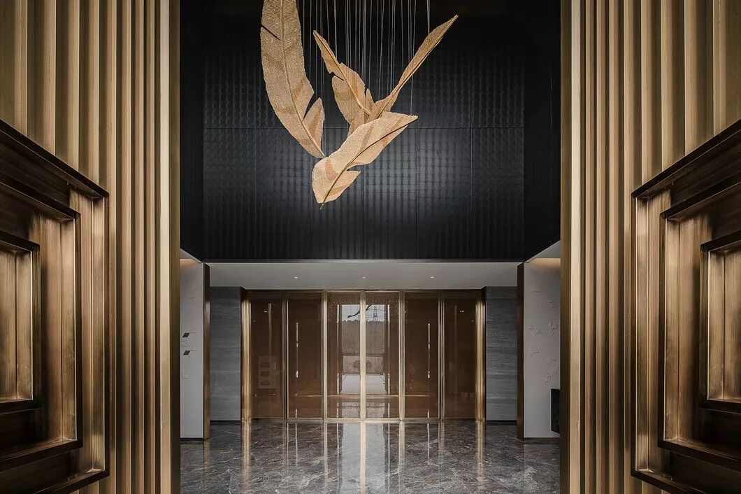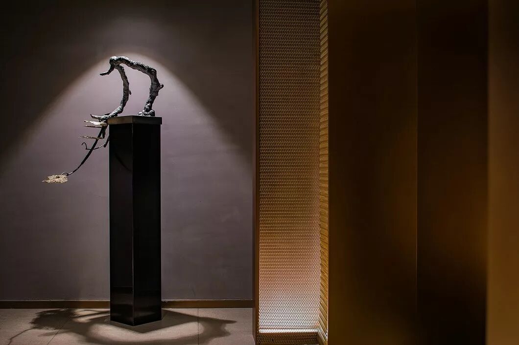 接待区,一件造型柔美的羽毛装饰雕塑作为本案开篇,轻盈灵动的羽毛与厚重沉稳的金属、石材形成鲜明对比,一刚一柔,藏秀于中,赋予空间生命与趣味性。