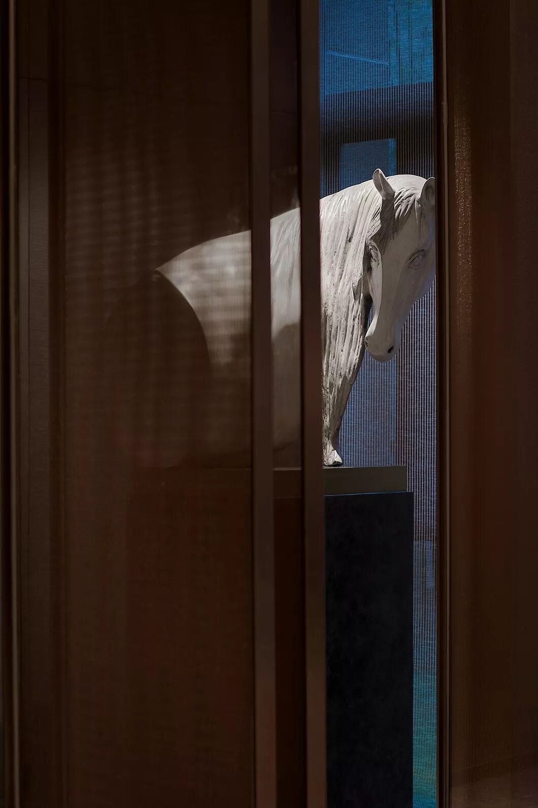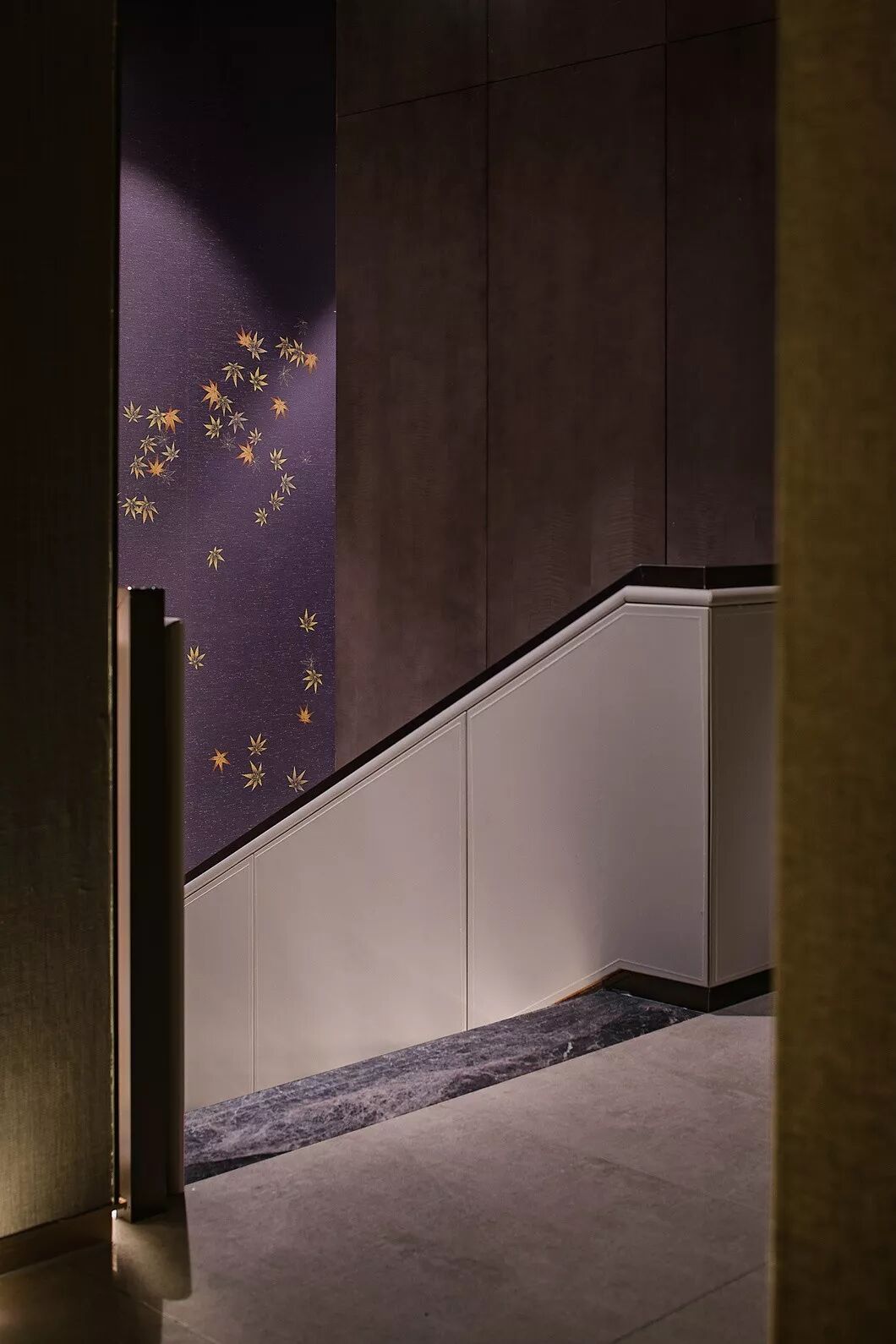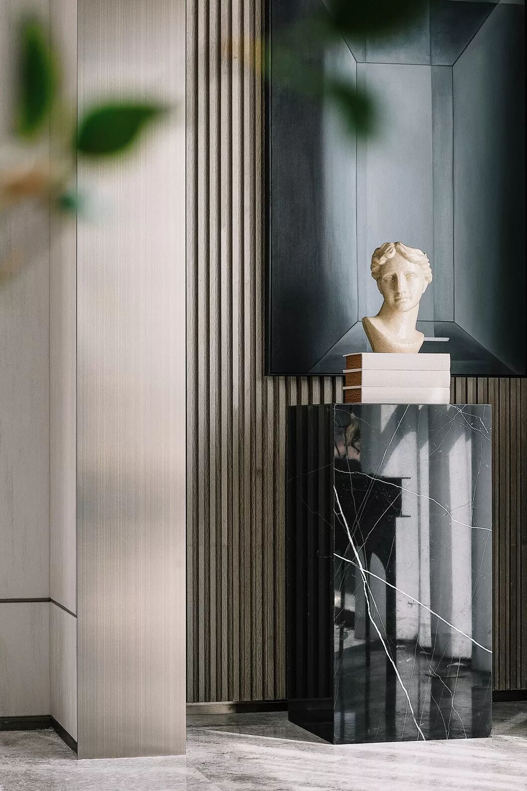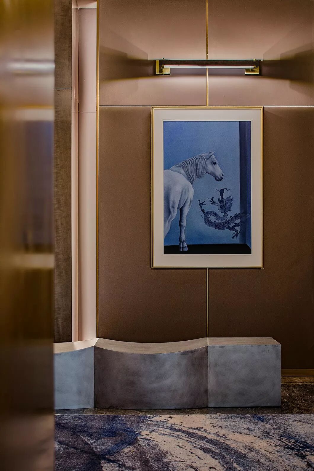 接待区,一件造型柔美的羽毛装饰雕塑作为本案开篇,轻盈灵动的羽毛与厚重沉稳的金属、石材形成鲜明对比,一刚一柔,藏秀于中,赋予空间生命与趣味性。