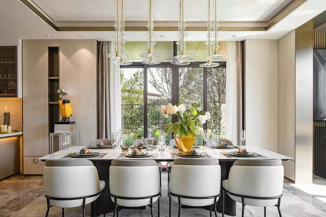客厅与餐厅相连,大面宽落地窗将视野由内而外延伸,自然光由通透的玻璃窗铺洒进来,为居室附上一层温馨恬静的光晕。