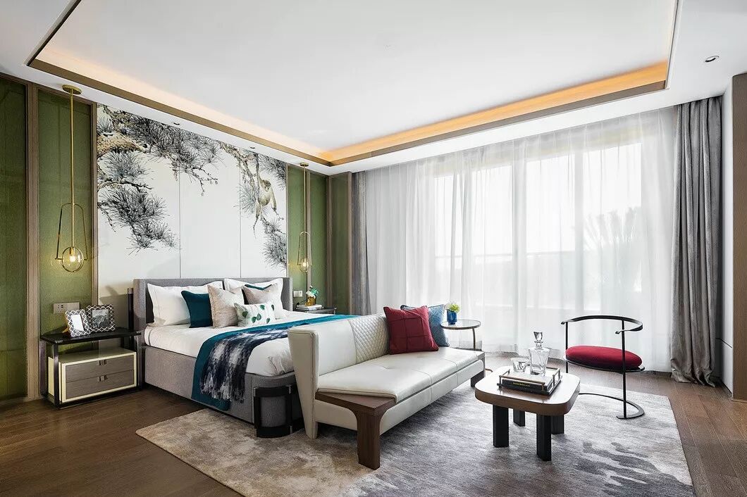 主人房延续了整个户型优雅冷静的调性,线条明快的家具搭配色泽柔和的木地板,落地窗外的自然风景成为了房间中最美的景致,同时营造出和谐舒适的感觉。