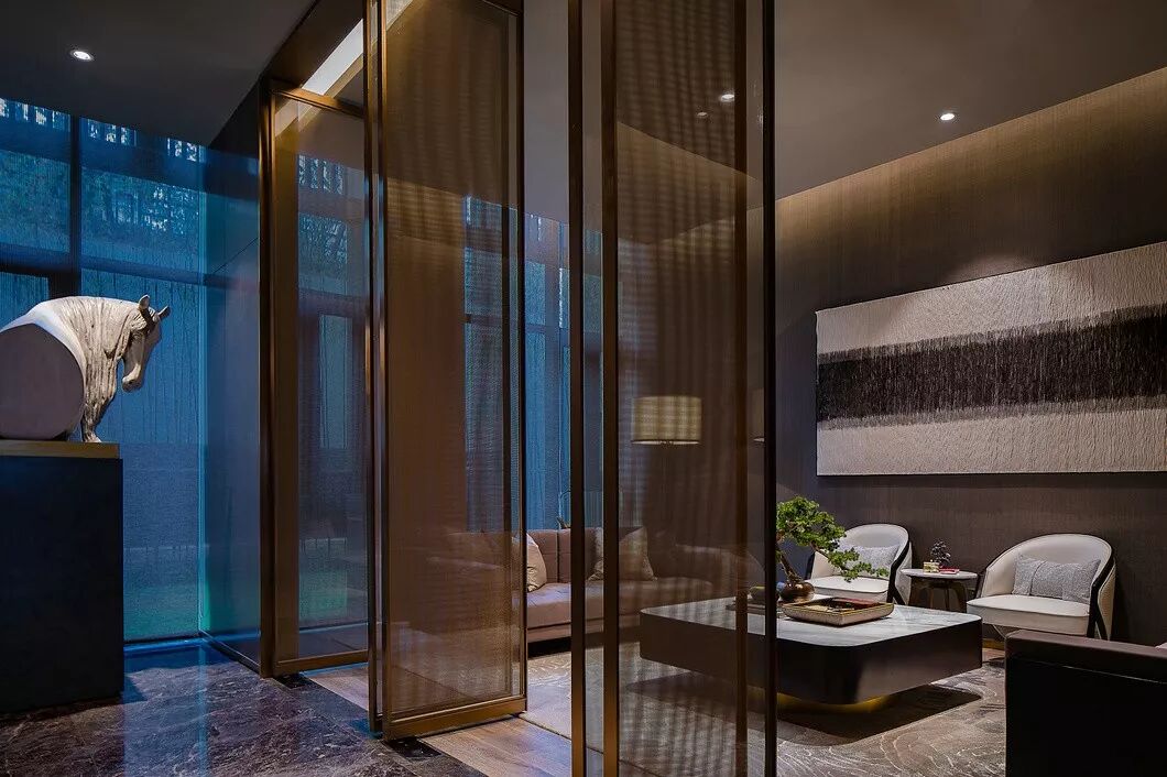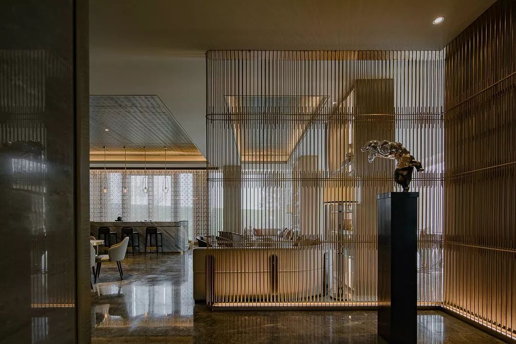 设计师从形式上充分考虑了空间开合的有序性及层次性,以金属格栅屏风进行空间划分,视线隔而不分,形成一种空间透明性,又达到虚实相间的效果。