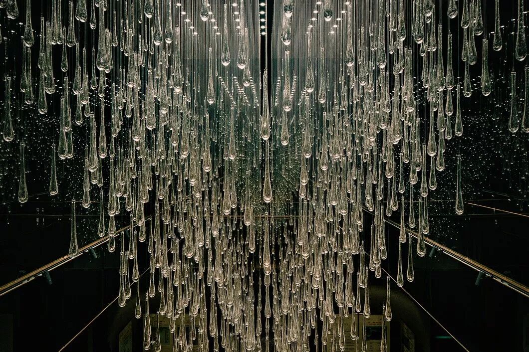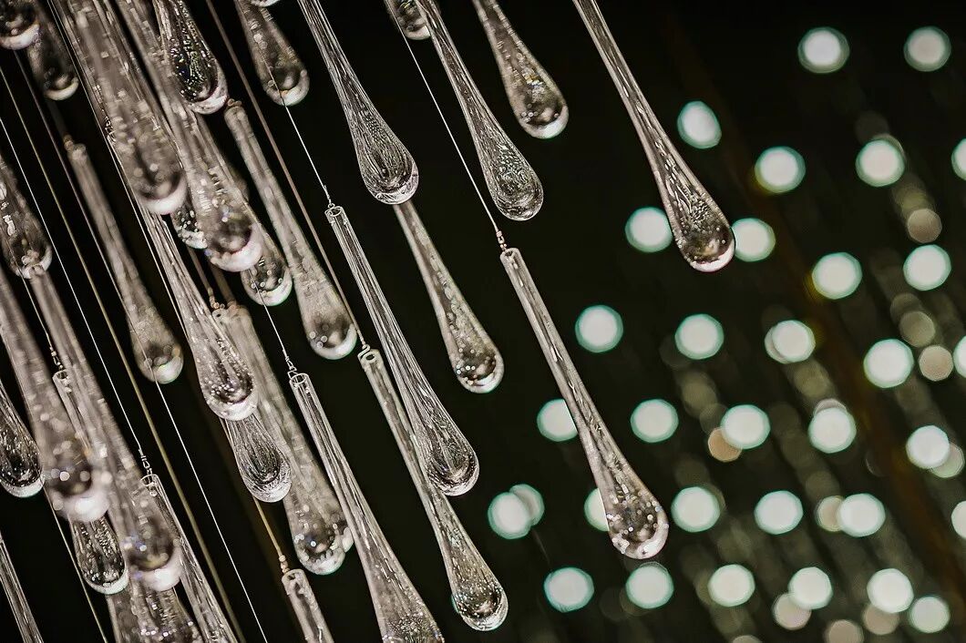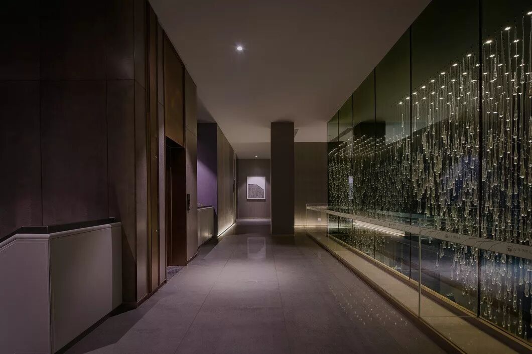 晶莹剔透的水晶装置大灯似宝石项链一般悬垂而下,以一种内敛且冷静的方式向人们呈现了一个美学力量和艺术精神兼具的空间。