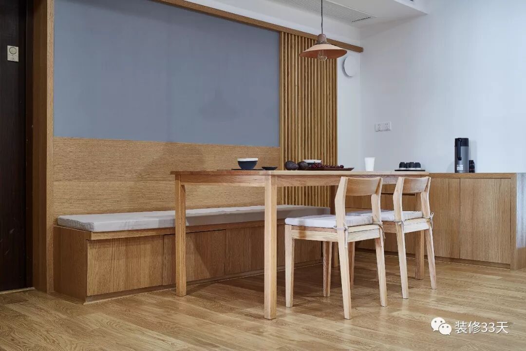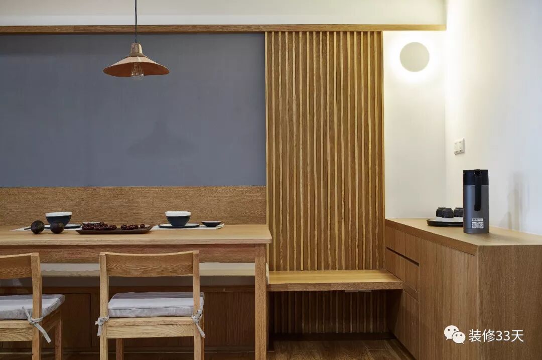 ▲ 卡座层板连接靠墙餐边柜,天然木作纹理清晰,原木色搭配灰色制造质朴背景