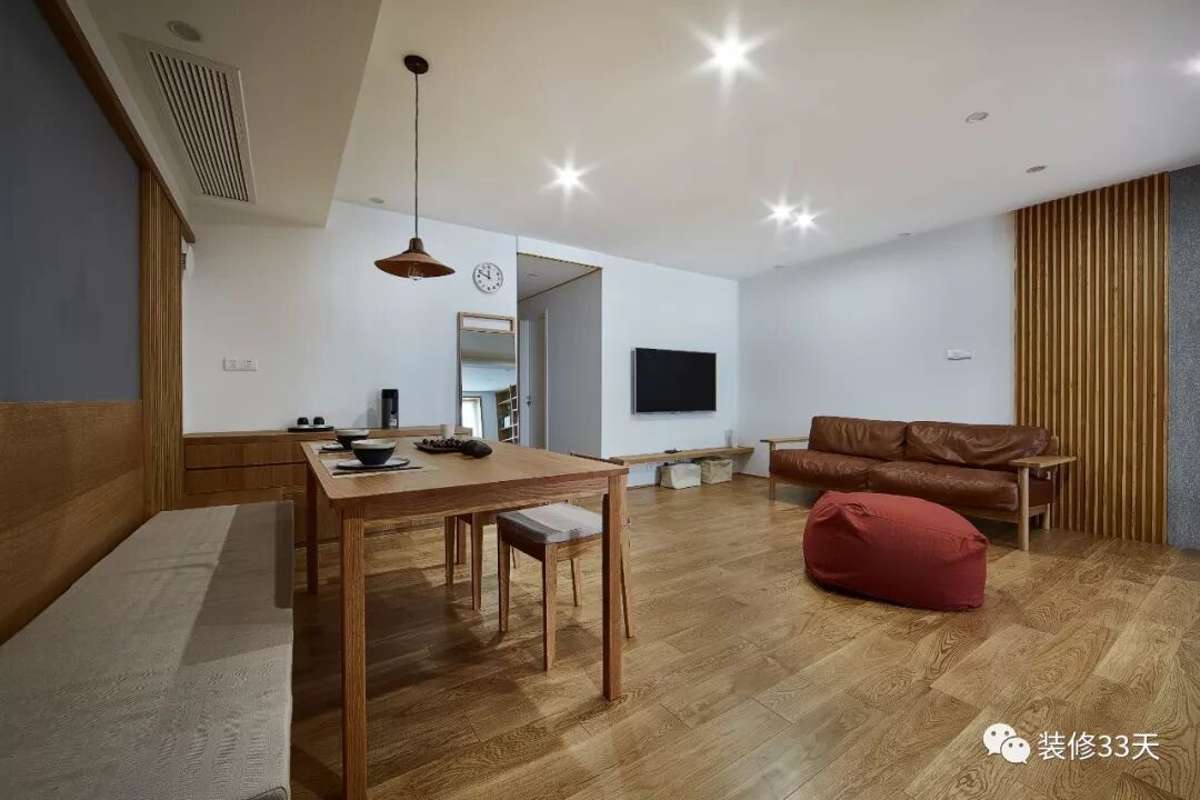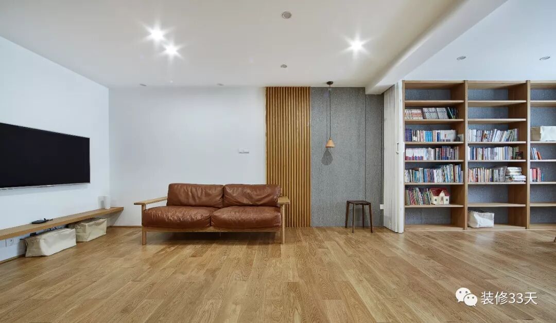 ▲ 客厅地面通铺木色地板呼应整室木色元素,搭配留白墙面,呈现质朴自然居家环境