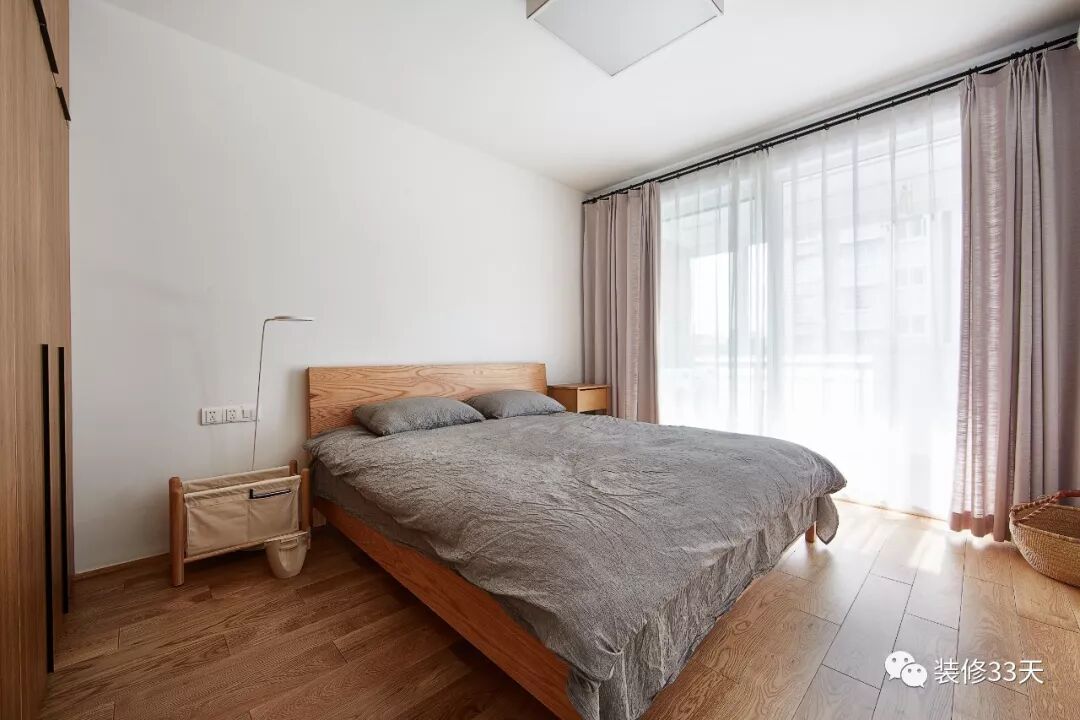 ▲ 主卧地面延续木地板与留白墙面,搭配原木家具,浅紫色窗帘与灰色床品,营造舒眠氛围