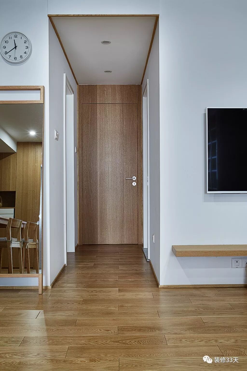 ▲ 建筑面积89平,总造价35万,入户木色鞋柜,中部留空加入层板,方便分类置物