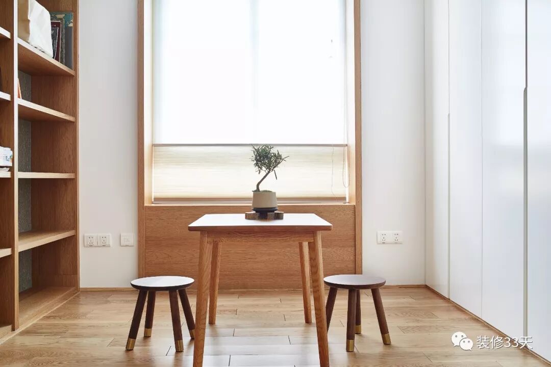 ▲ 白色与木色营造质朴安静的纯净空间,储物柜与书架提供充足收纳空间