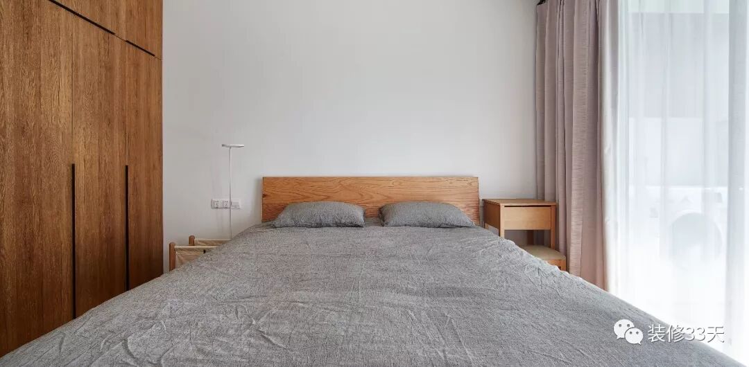 ▲ 木质大床左右分别放置不同的机能家具,木作大衣柜解决空间储物需求