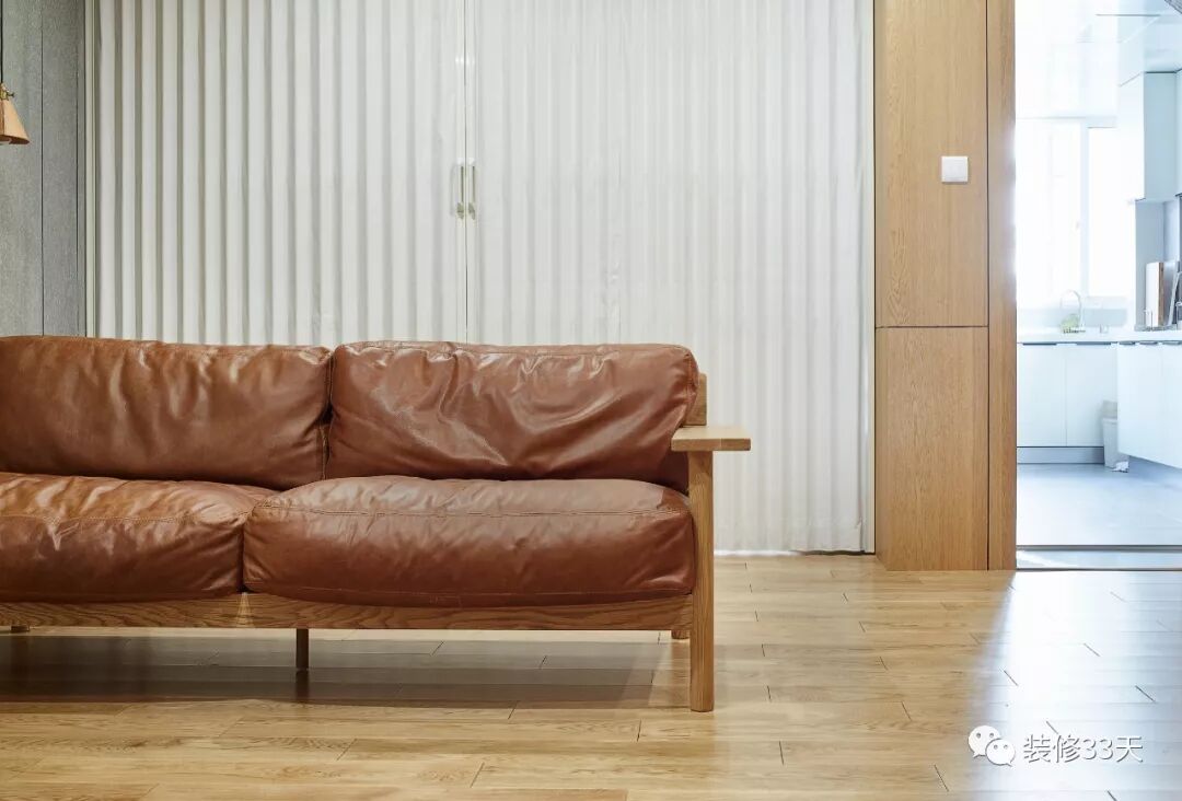▲ 一张皮质沙发,色泽温润,实木框架与焦糖色给空间带来一抹暖意