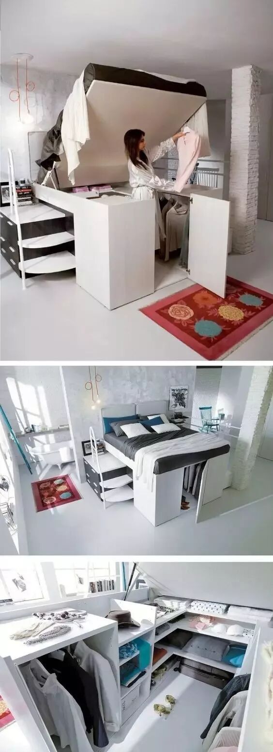 将床抬高,做成类似榻榻米的床位,利用内部的存储空间。