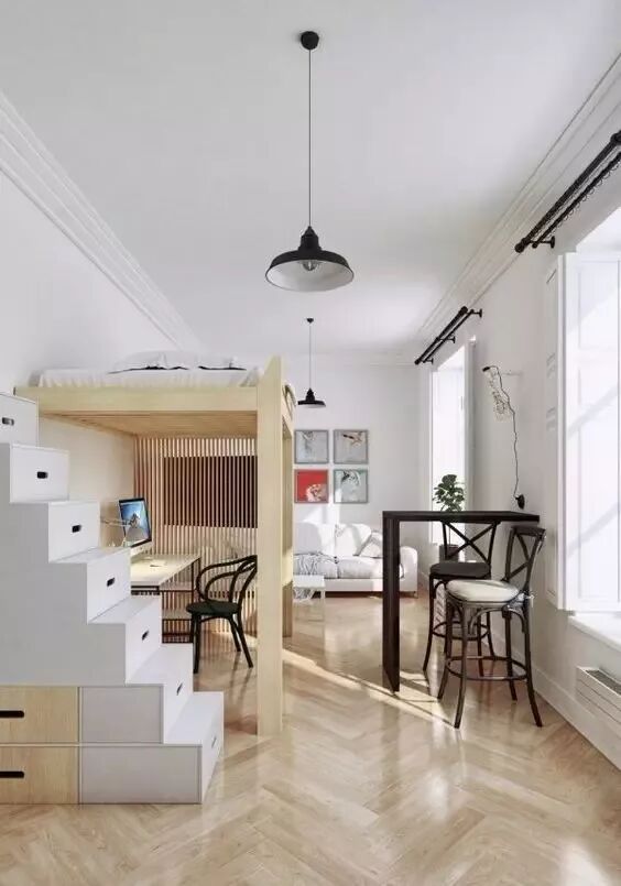 如果卧室空间太小,不妨参考学校宿舍的布置,上床下桌,空间立马大一倍!