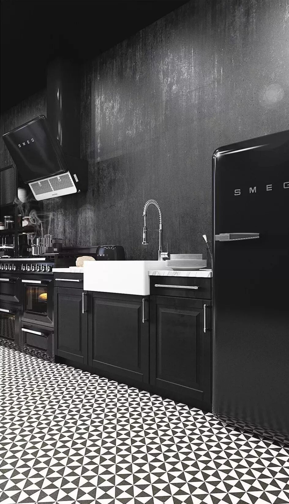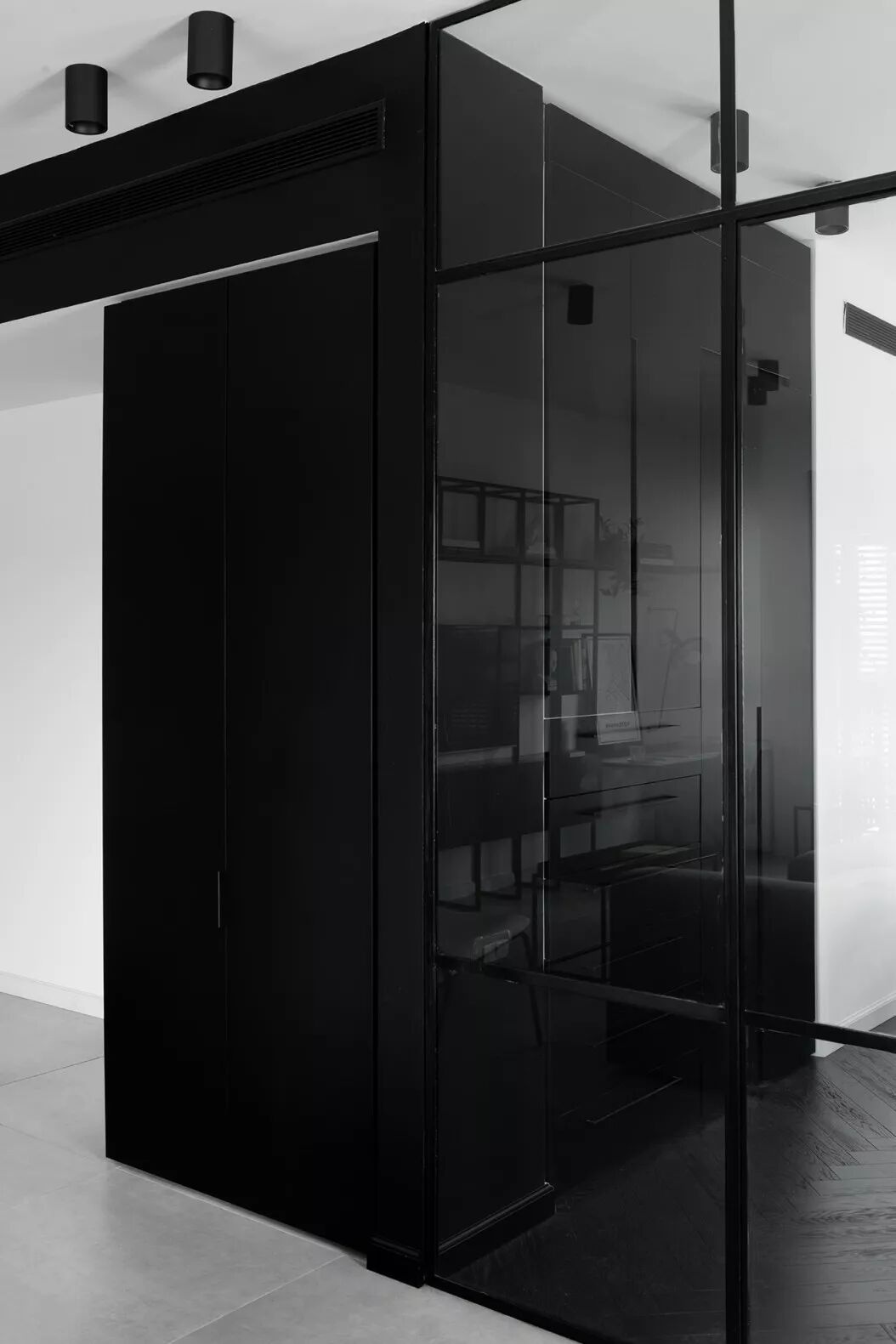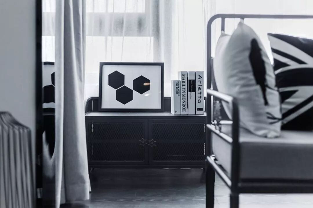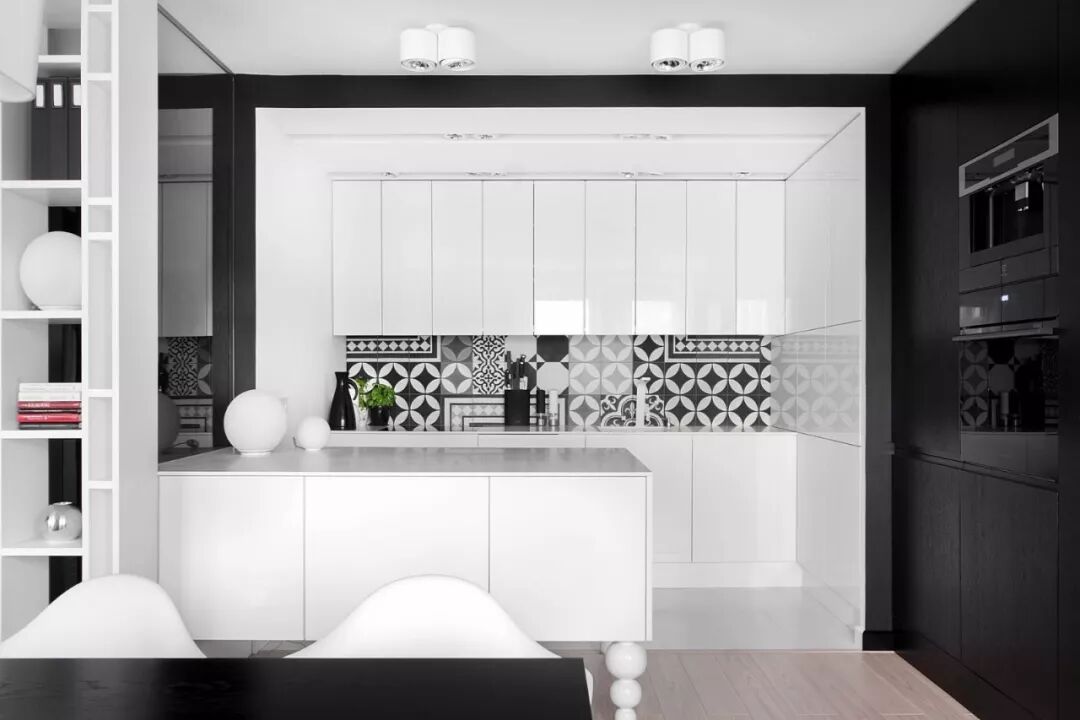 小面积的黑白碰撞也非常有意思。基于黑白的和谐性,两相结合,黑白两色绘出的繁复图案总能给人以高级感,再复杂的搭配最终也能够形成简约精致的空间效果。