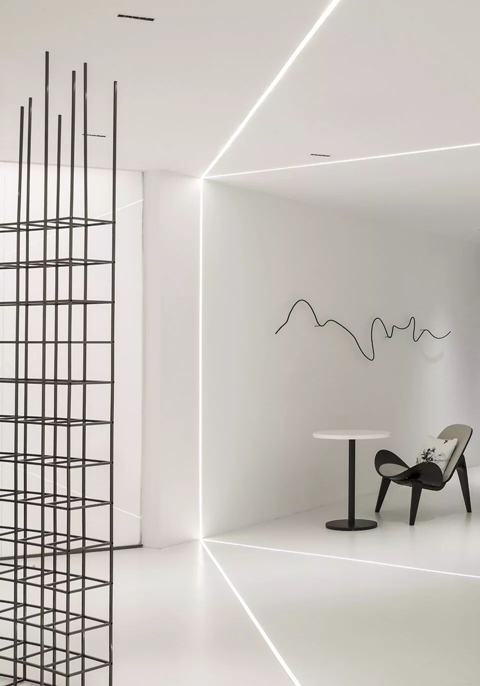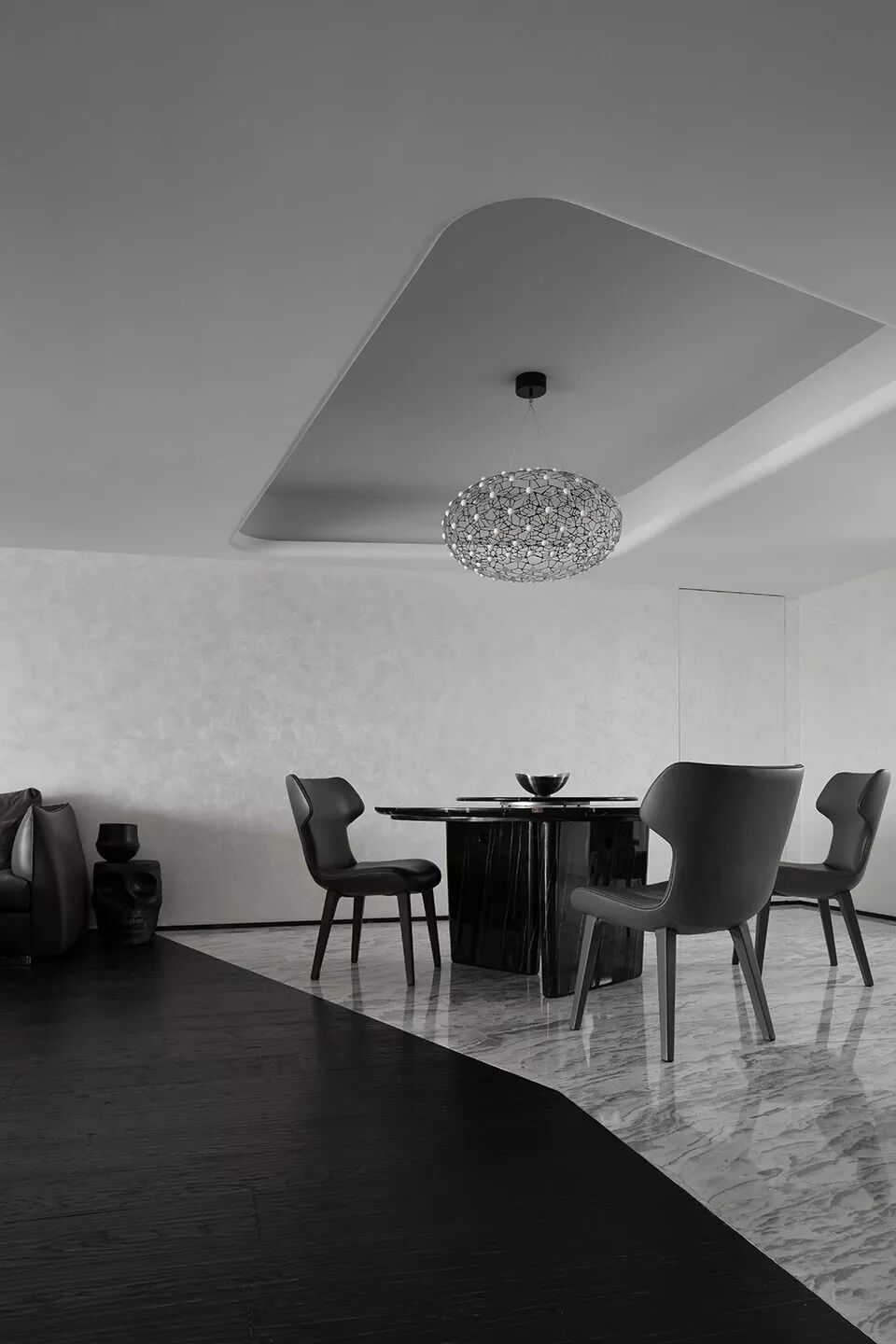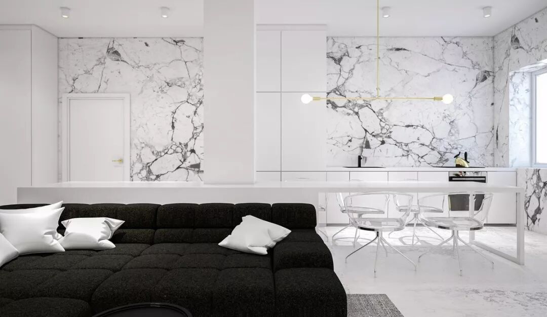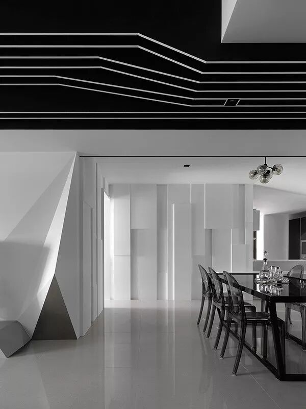 曲线更多变,也更擅长隐匿。不同层次的黑,与洁白配合能交叠出奇异的效果;线条弯折成令人惊叹的弧度,强烈的黑白表现艺术感;又或者像大理石的黑色纹理,游走于白璧无瑕间妙趣横生。