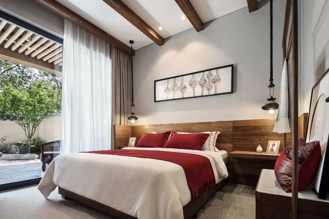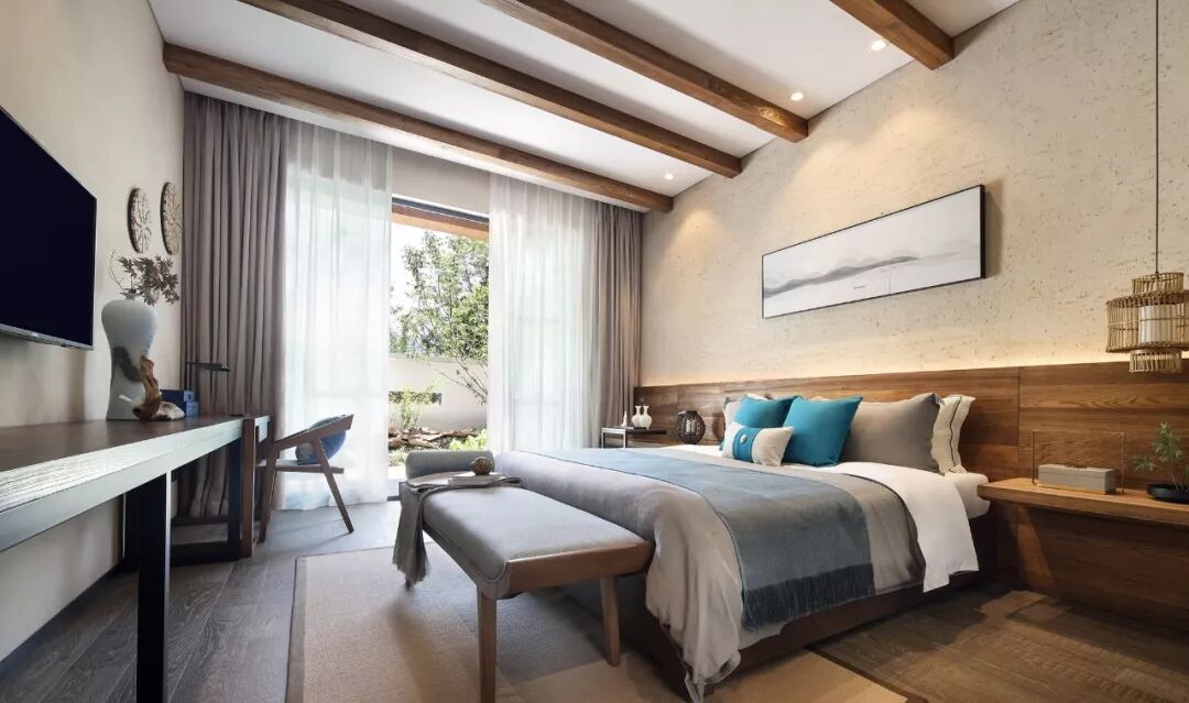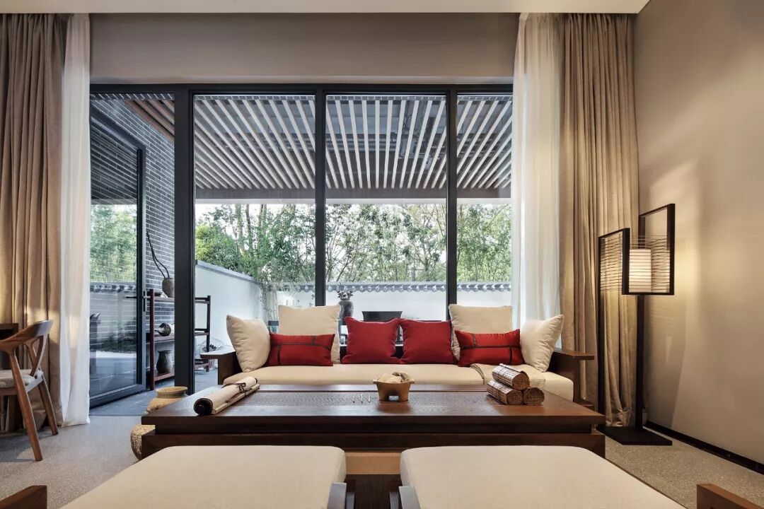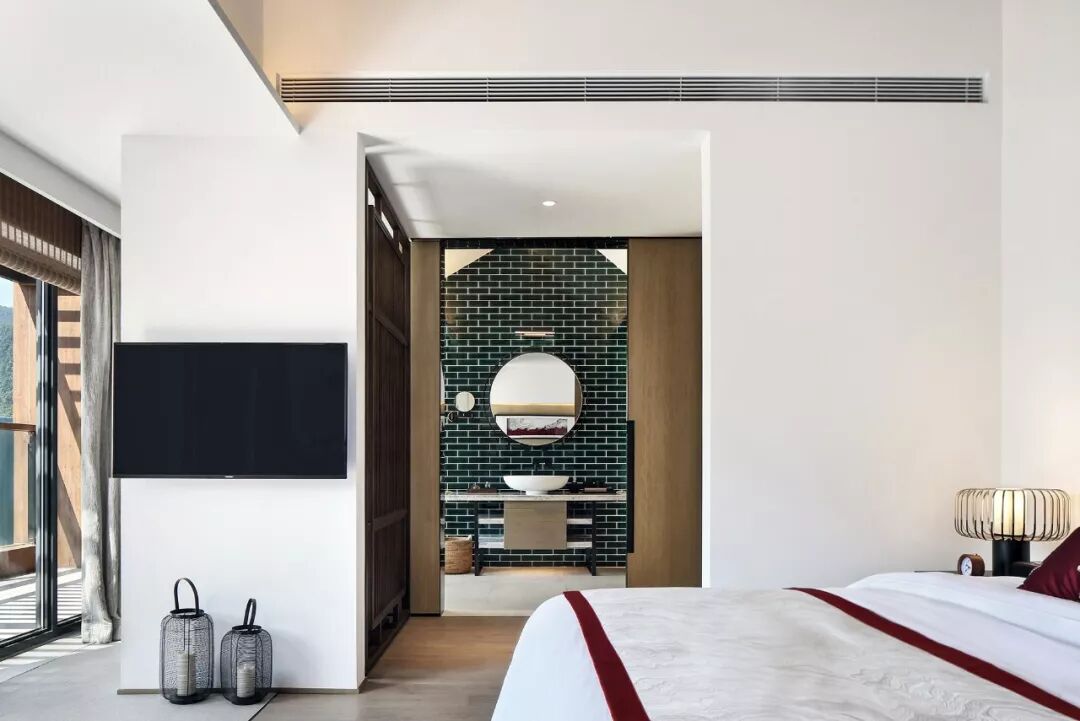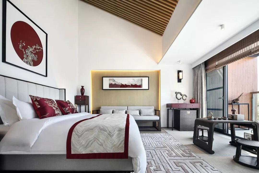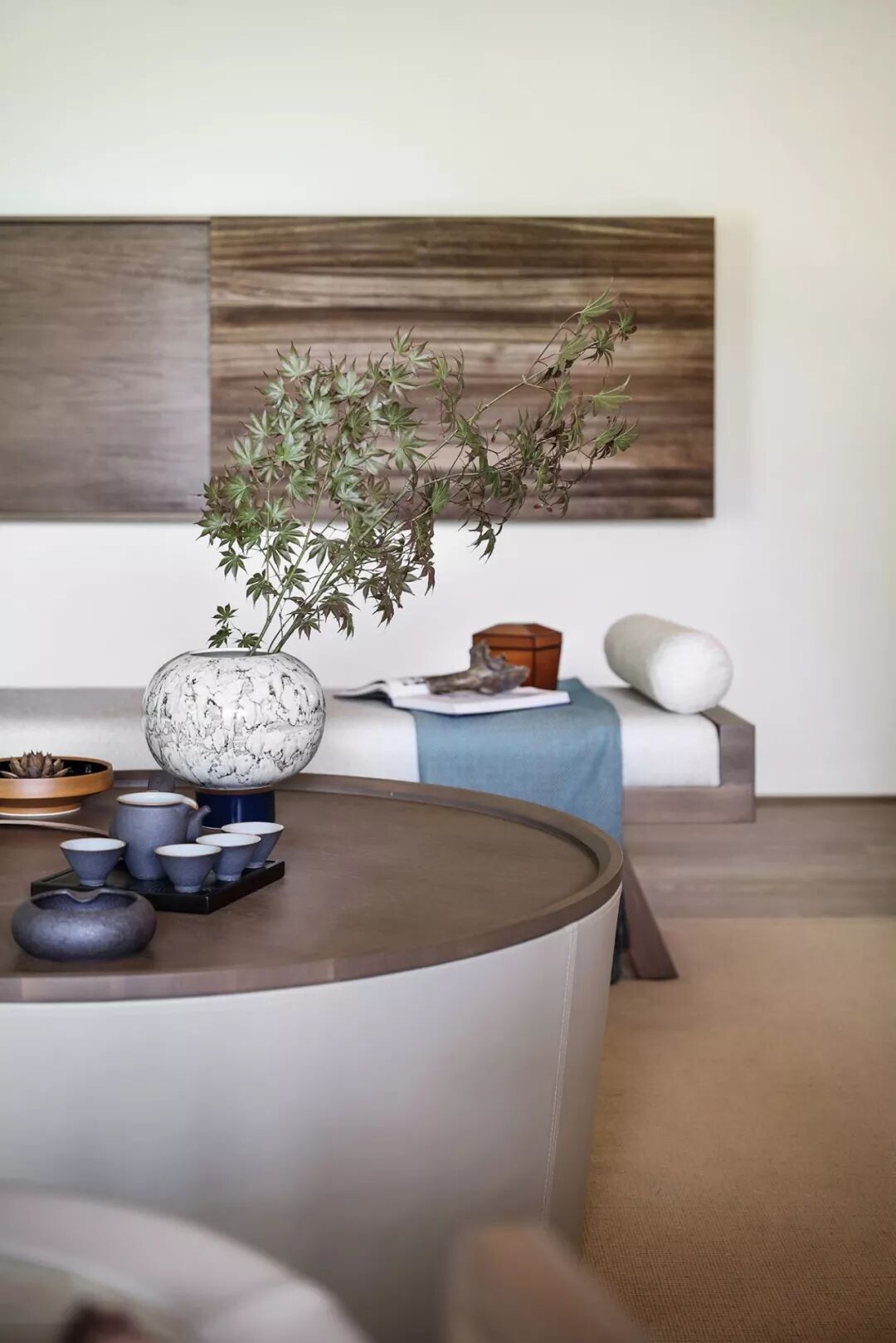 空空院整体呈现素雅的色调,同时融入低调跳跃的袈裟红,提亮整个空间的视觉感,让每一位身居此处的住客感念宽广心胸,烦恼消散。