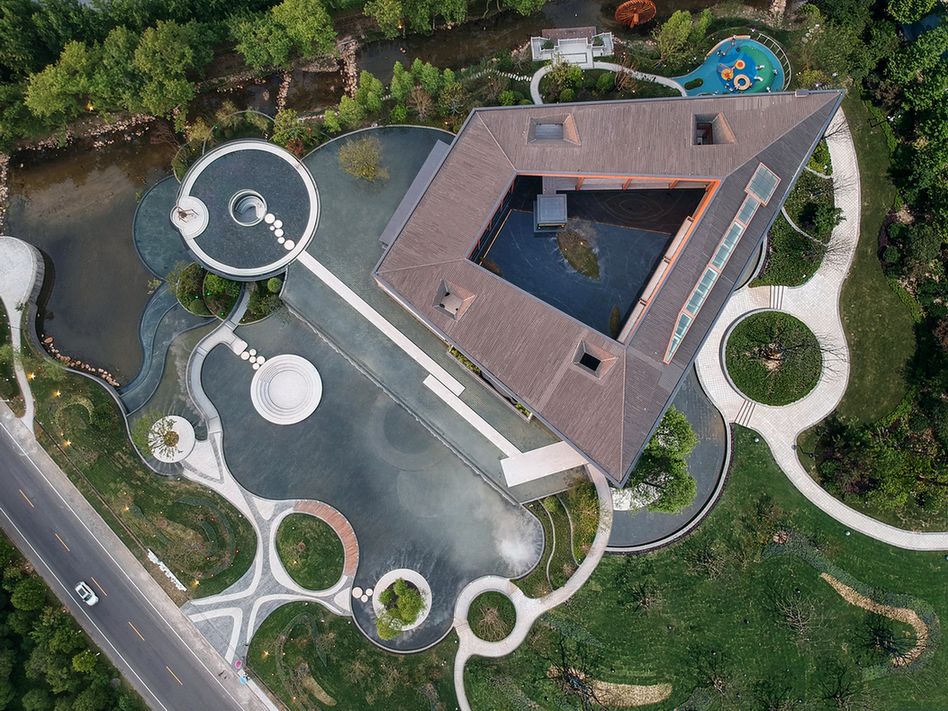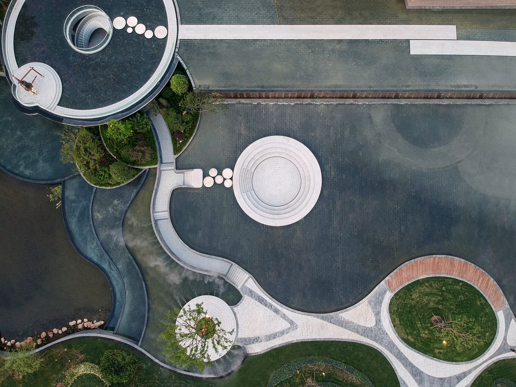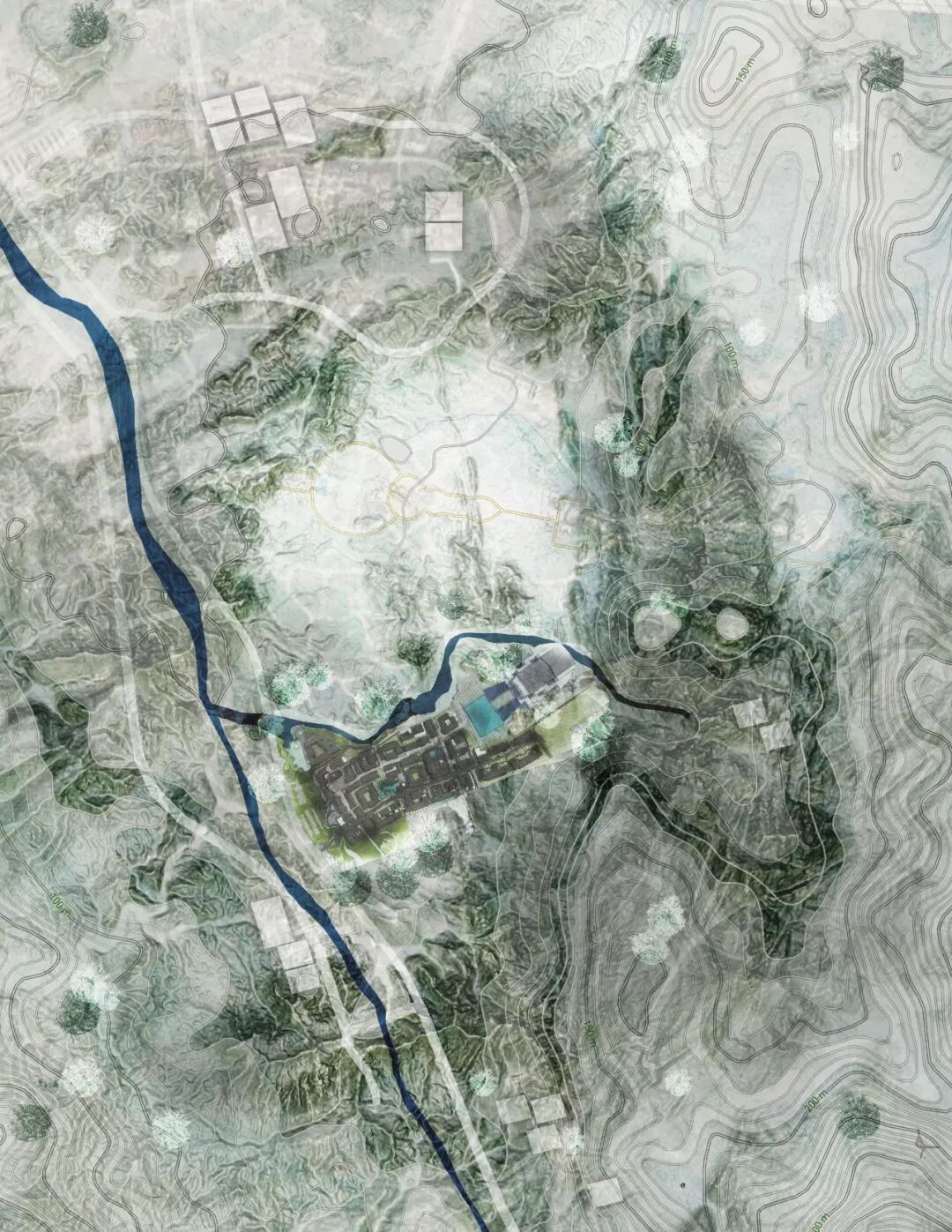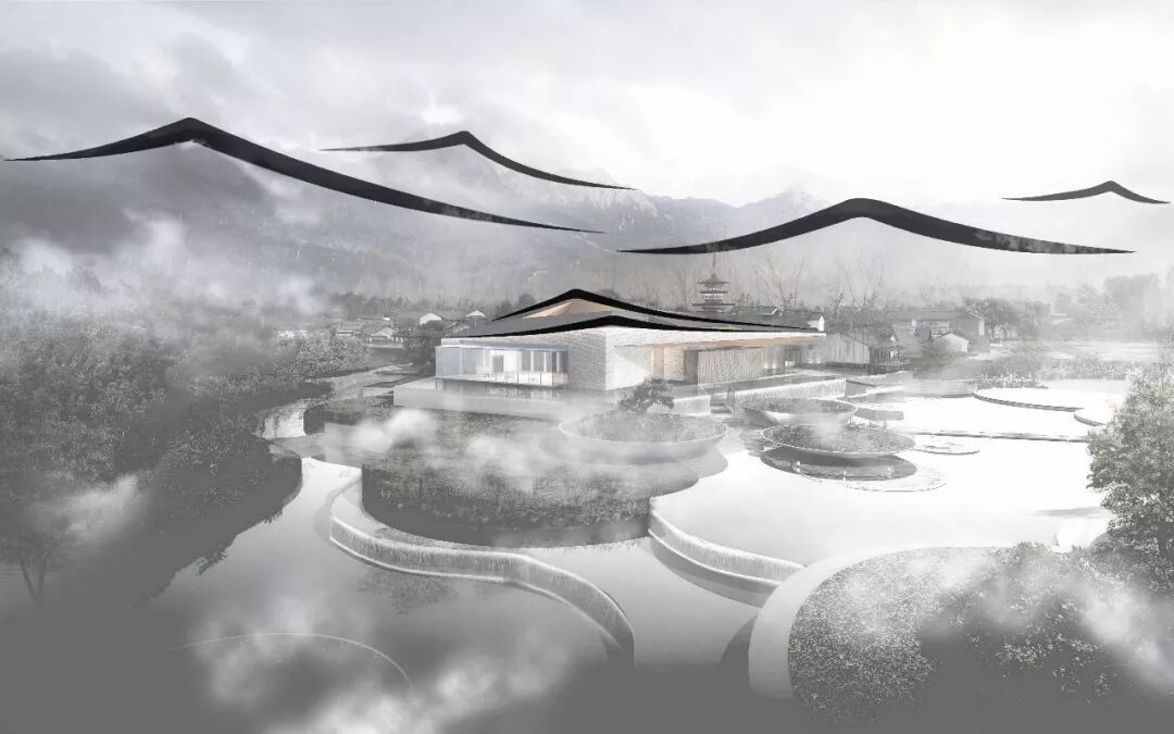 中国的山水文化历史悠长,悟禅养心之所也常常依山傍水,山水相合,以山水之性静养心境。建筑坐落于开阔的场地之上,群山环绕,周围罗布广阔的水面,层叠不止,若大小玉盘。禅院入口需寻水势蜿蜒而上,穿行中豁然开朗。