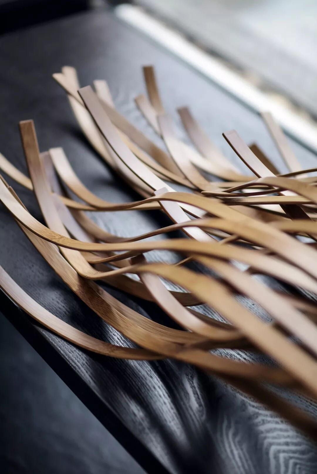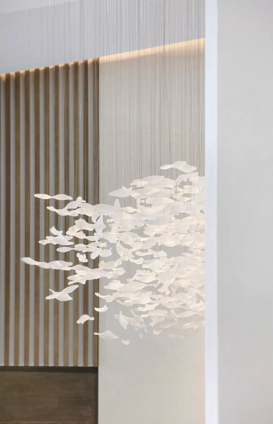 临窗一侧与接待厅同源而生的竹艺饰品点亮空间,好似竹枝飘动,水流潺潺。