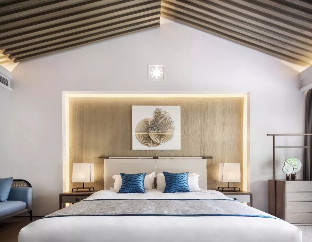 山水·风白专为前来九华拜佛朝圣的旅客设计,山水莲花,佛前灯烛,自然的木色,旨在打造一个清新素雅的空间,灰蓝色系搭配棉麻质感的布艺,淡蓝与留白,惬意雅致又内敛平和。