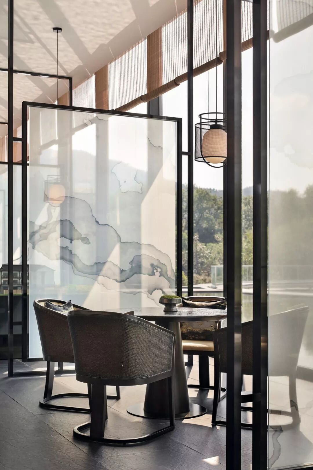 通透的隔断让空间整体保持开放,同时为了保证空间的私密性及独立性,各个区域之间又以取自九华当地的墨色山水与云雾形态的屏风,隔离出小型恰谈区,宛若山水云间。
