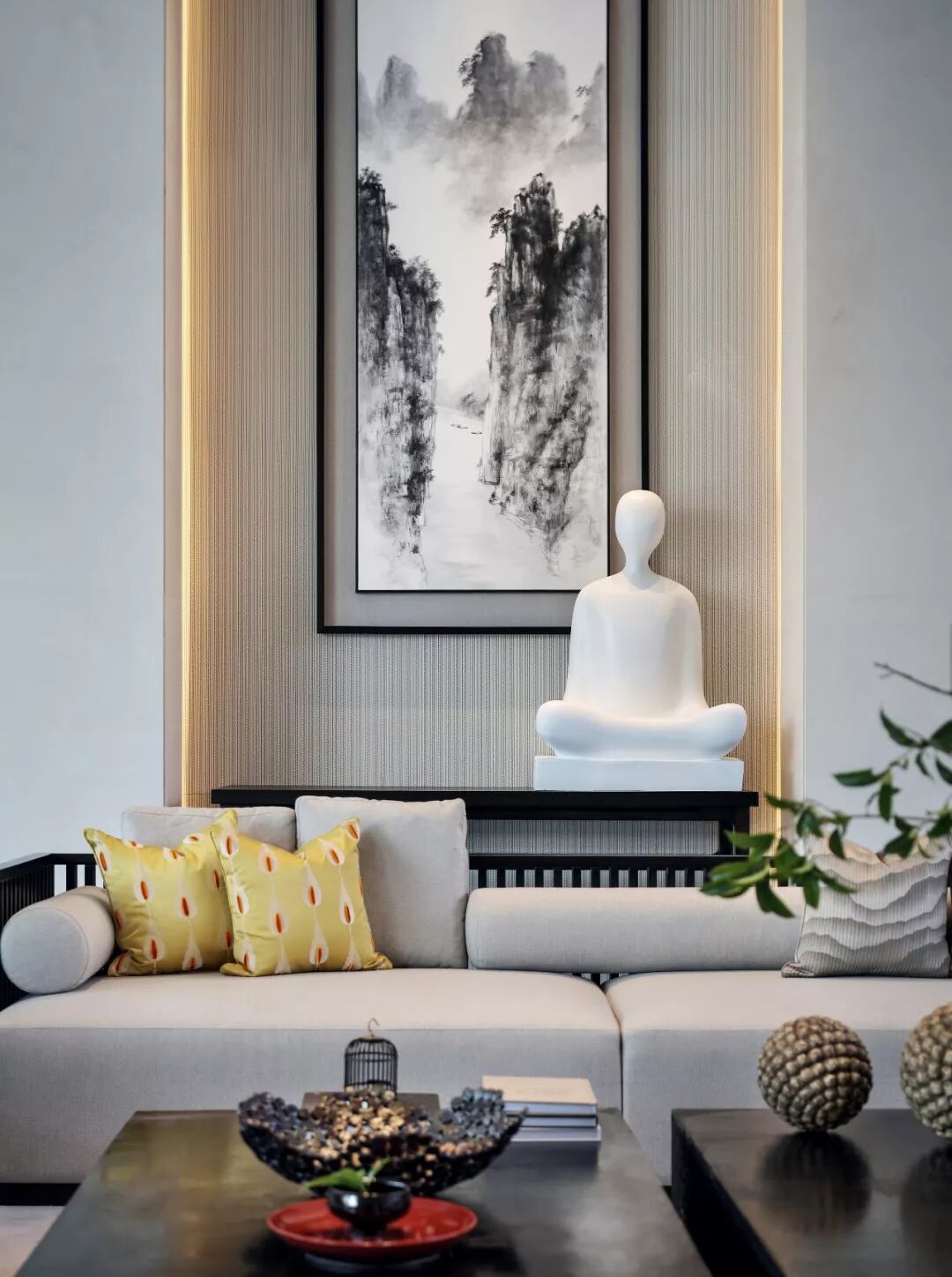 每个单独的区域都以独特的灯饰、花器、艺术摆件布局,让空间变得更加丰富和饱满,无论居于何处都可以看到内庭亦或外院空间的极佳景致。