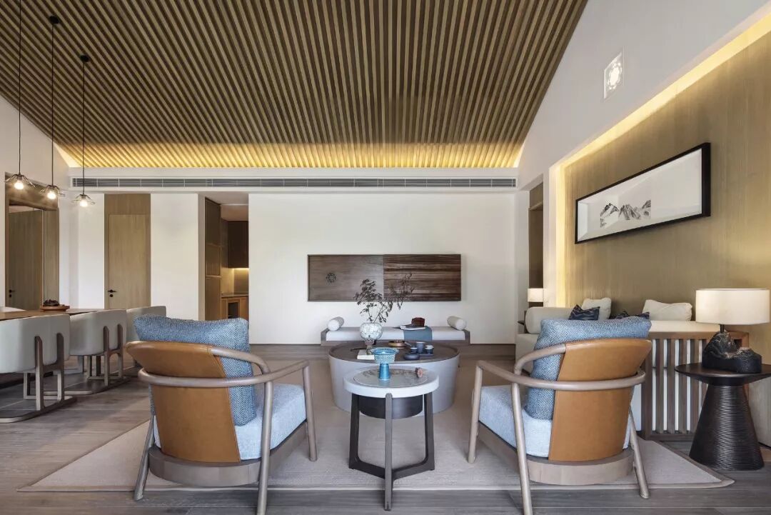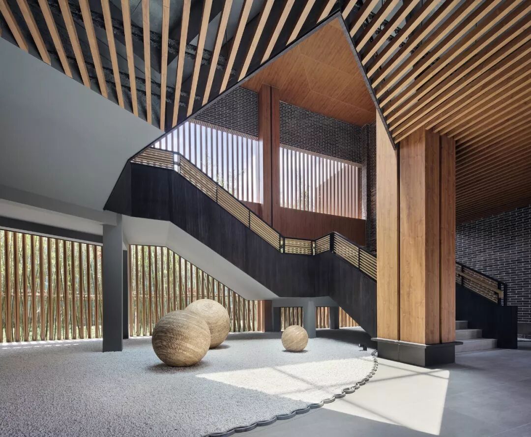 “耳得之而为声,目遇之而成色。”眼睛是最先感知外物的器官,接待空间也被定义为“眼根”所在。九华多竹,设计师特意找到由台湾当代艺术家独创的竹意灯饰作为点缀,以竹材诠释出自然力量的流动,如风、如水、如鸟翱翔,也增加了与当地自然环境的契合感。